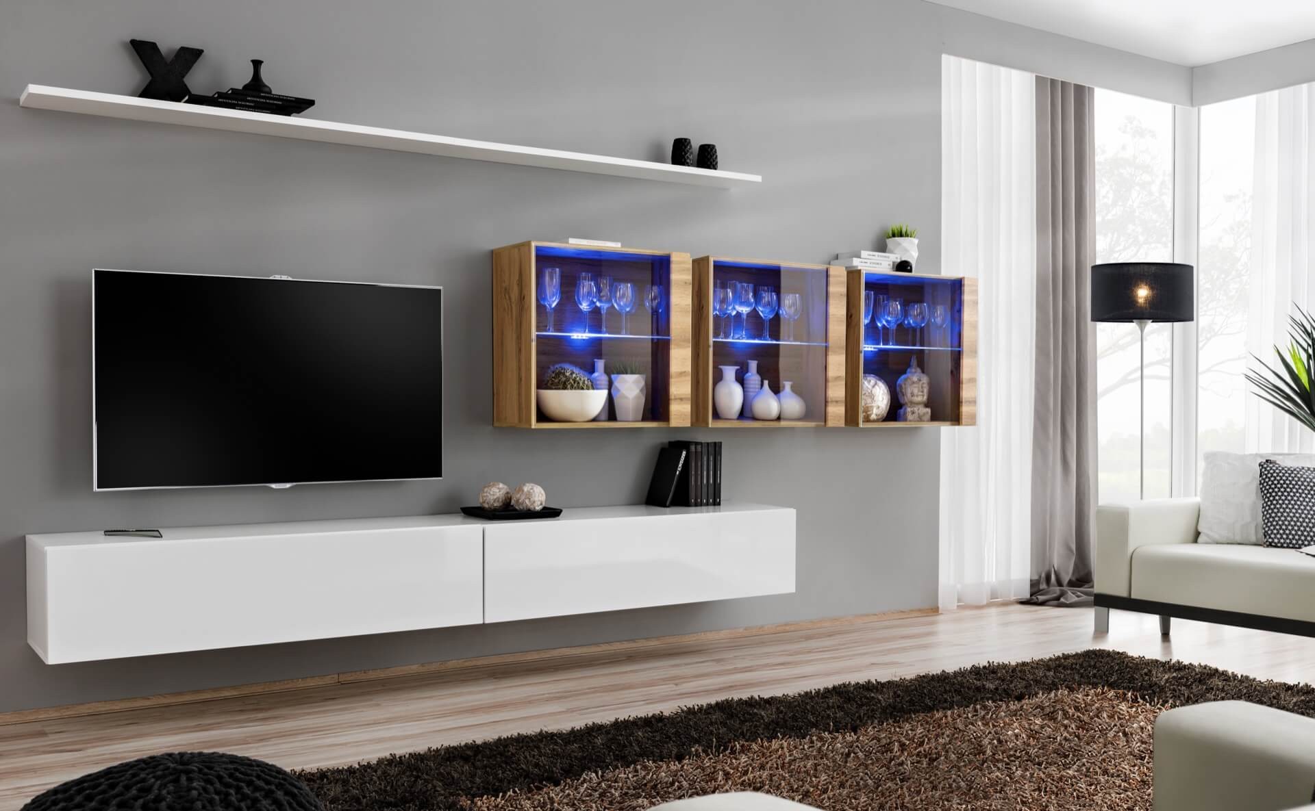 - 3 x witryna: drzwi pojedyncze, częściowo przeszklone, za nimi jedna półka szklana, podświetlona niebieskim oświetleniem LED