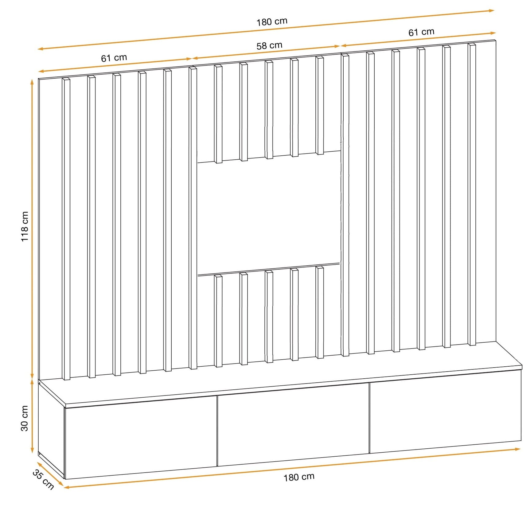 - RTV: 180 cm (szerokość) x 30 cm (wysokość) x 35 cm (głębokość)