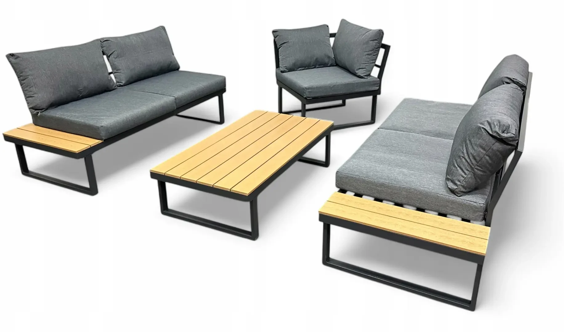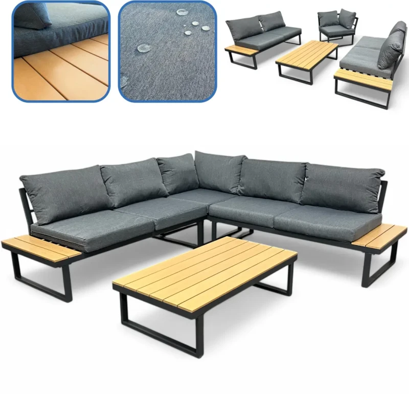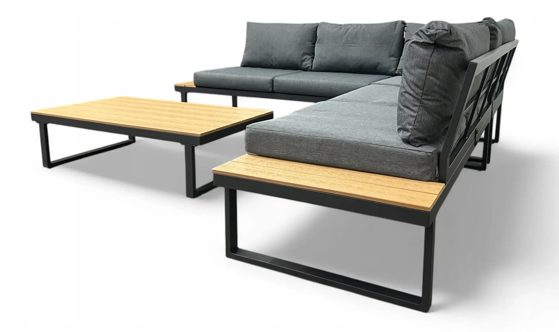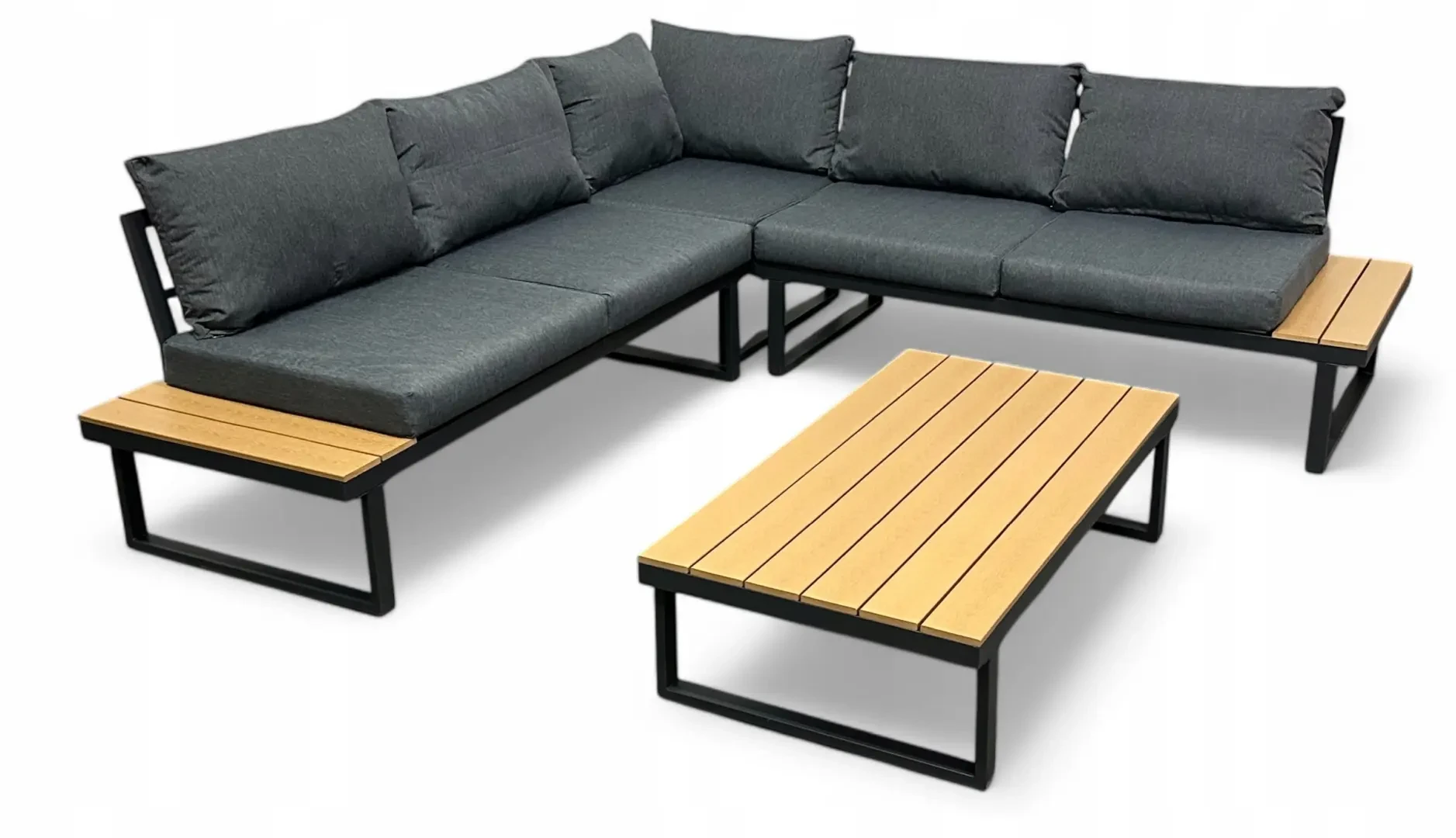 Mega komfortowy narożnik z poliwoodu imitujacego drewno, wyposażony w miękkie poduchy jest stworzony do relaksu. Pomieści wszystkich gości i zapewni im wygodę nawet podczas dłuższego odpoczynku. A jeśli planujesz chwilę dla siebie stolik z solidnym blatem pomieści książki, czasopisma i pyszną kawę, czyli wszystko to co do relaksu niezbędne. Świetnie sprawdzi się na tarasie i będzie stanowił wspaniałą bazę do urządzenia wymarzonego kącika do relaksu.