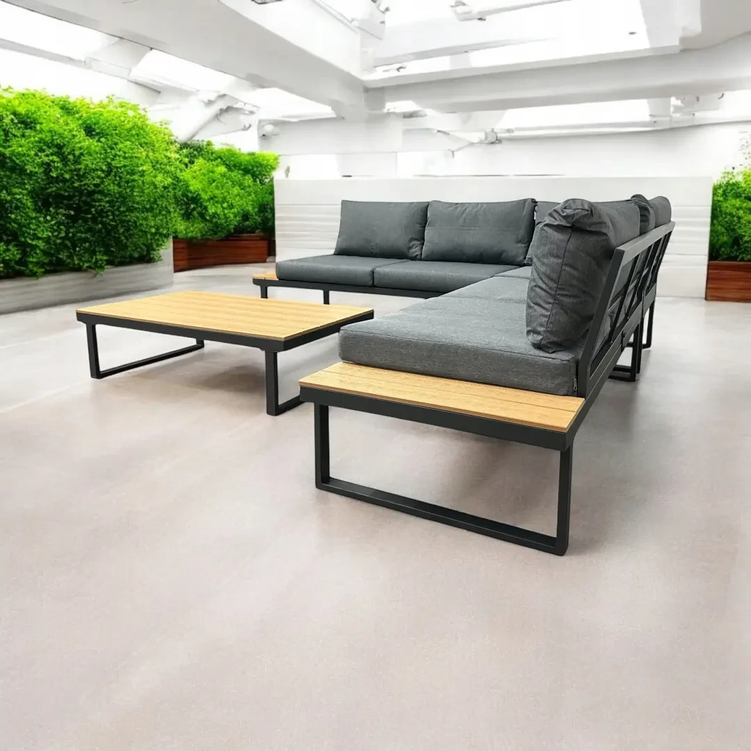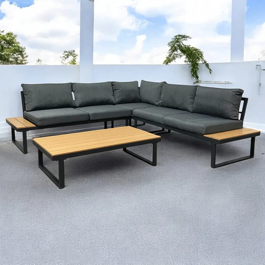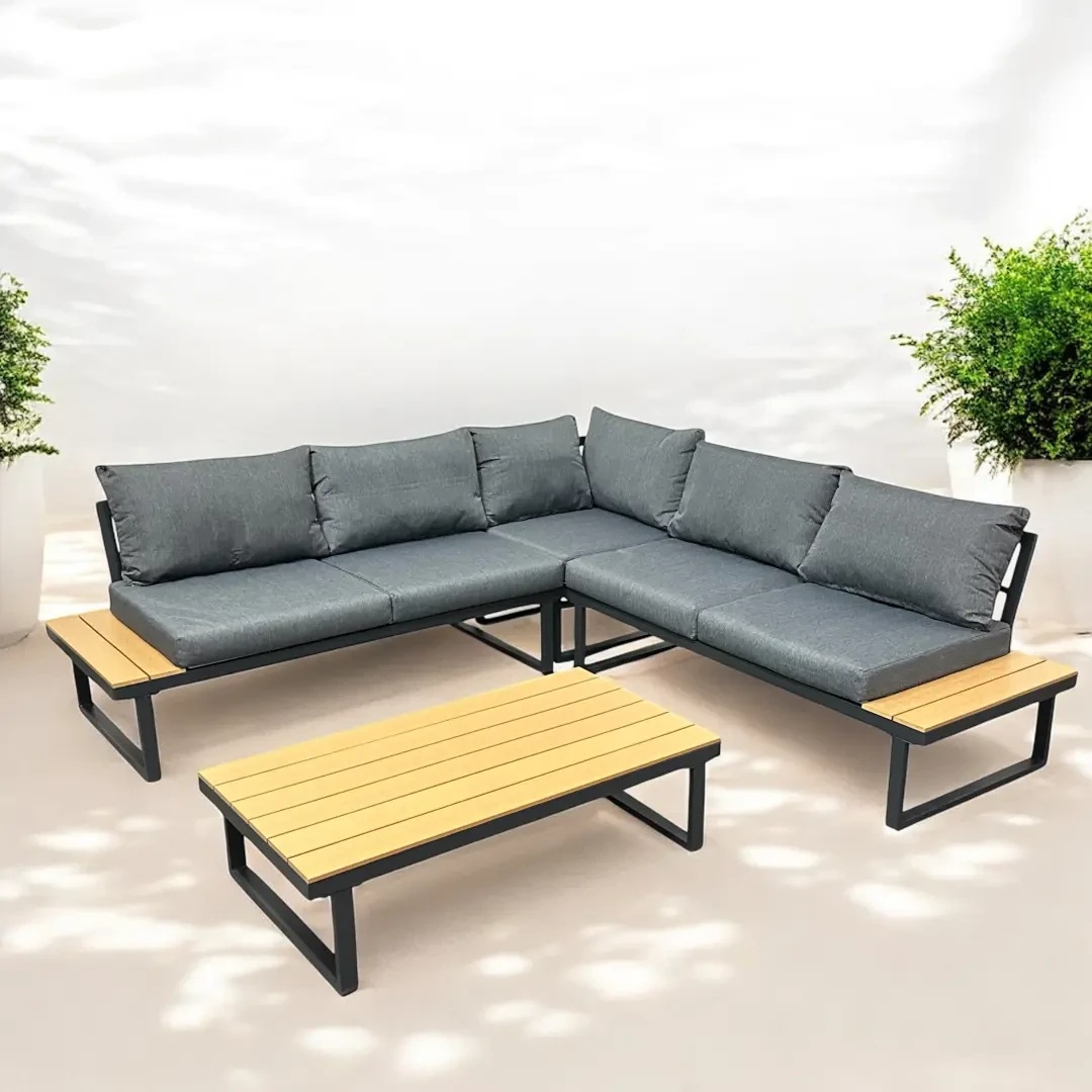 Mega komfortowy narożnik z poliwoodu imitujacego drewno, wyposażony w miękkie poduchy jest stworzony do relaksu. Pomieści wszystkich gości i zapewni im wygodę nawet podczas dłuższego odpoczynku. A jeśli planujesz chwilę dla siebie stolik z solidnym blatem pomieści książki, czasopisma i pyszną kawę, czyli wszystko to co do relaksu niezbędne. Świetnie sprawdzi się na tarasie i będzie stanowił wspaniałą bazę do urządzenia wymarzonego kącika do relaksu.