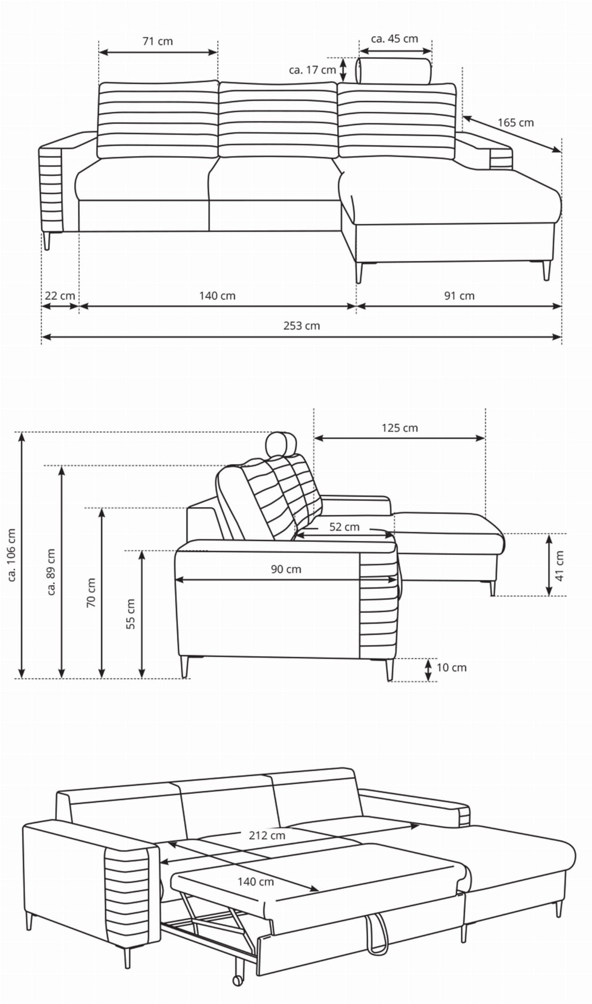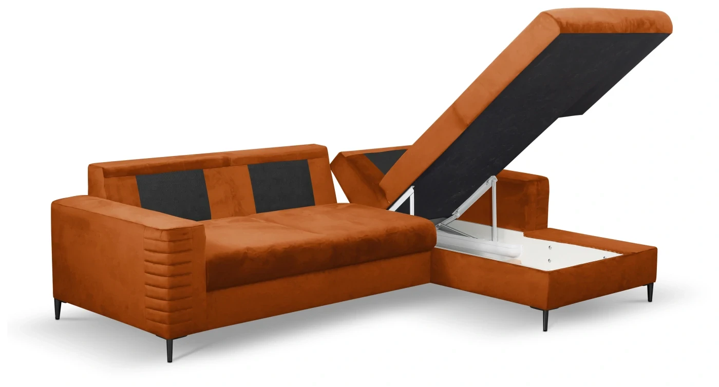 - Funkcja spania – szybkie i łatwe rozkładanie z automatem wspomagającym pozwala przekształcić narożnik w wygodne łóżko o powierzchni 140 x 212 cm, idealne dla gości lub na co dzień.