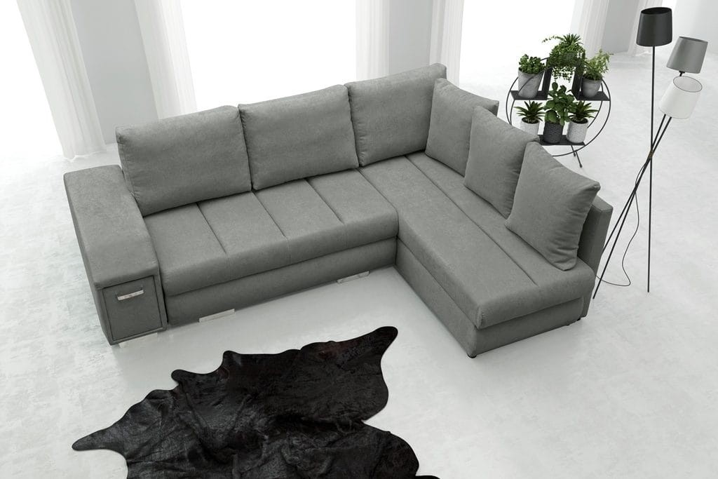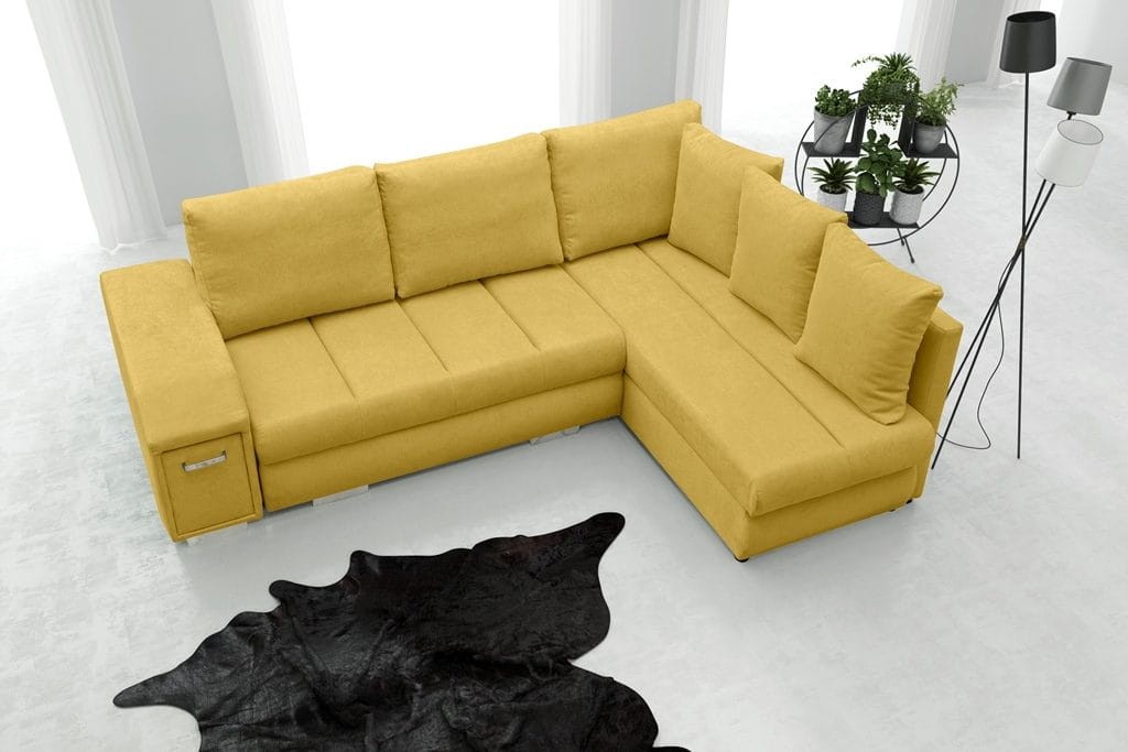 Narożnik z funkcją spania Arni to klasyczny acz i nowoczesny narożnik rozkładany do salonu. Mebel został zaprojektowany w funkcjonalny i przemyślany sposób oraz wykonany wyłącznie z najlepszych materiałów. Prosta bryła o standardowym dla tego rodzaju mebli rozmiarze pozwala na idealne dopasowanie narożnika do każdego pomieszczenia. Arni sprawdzi się zarówno w dużych salonach, jak i w mniejszych mieszkaniach. Subtelne nóżki w połączeniu z elegancką tkaniną idealnie dopełniają kompozycję tego mebla. Oparcie narożnika zawiera dodatkowo 6 wygodnych poduch, dzięki którym każdy znajdzie na nim komfortową pozycję. Narożnik wyposażony został aż w dwa pojemne schowki na pościel oraz nowatorską skrytkę w podłokietniku, dzięki czemu przechowywanie nie będzie stanowiło więcej problemu. Intuicyjny system rozkładania pozwala przekształcić narożnik w łóżko o powierzchni spania 200 na 147 cm. Nowoczesny narożnik Arni zaprojektowany i wykonany został w Polsce co jest gwarancją jakości - Wspieraj