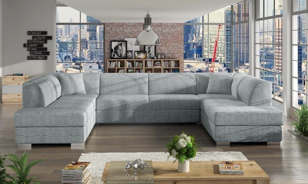 Narożnik z funkcją spania Darco U to klasyczny acz i nowoczesny narożnik rozkładany do salonu. Mebel został zaprojektowany w funkcjonalny i przemyślany sposób oraz wykonany wyłącznie z najlepszych materiałów. Układ w kształcie litery U zapewnia obszerną powierzchnię do wypoczynku i gwarantuje komfortowe użytkowanie nawet dla większej liczby osób, a prosta bryła o standardowym dla tego rodzaju mebli rozmiarze oraz możliwość łączenia dwóch kolorów pozwala na idealne dopasowanie narożnika do każdego pomieszczenia. Darco U sprawdzi się w dużych salonach i przestrzeniach, gdzie przyjmujemy gości i spędzamy czas wspólnie z rodziną. Subtelne, srebrne nóżki w połączeniu z elegancką tkaniną idealnie dopełniają kompozycję tego mebla. Wygodne, zaokrąglone oparcie zagwarantuje, że każdy znajdzie na nim komfortową pozycję. Narożnik wyposażony został aż w dwa pojemne schowki na pościel w otomanie, dzięki czemu przechowywanie jej nie będzie stanowiło więcej problemu. Intuicyjny system rozkładania z systemem delfin pozwala przekształcić narożnik w łóżko o powierzchni spania 270 na 130 cm. Nowoczesny narożnik Darco U zaprojektowany i wykonany został w Polsce co jest gwarancją jakości - Wspieraj