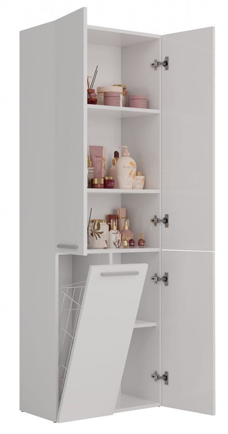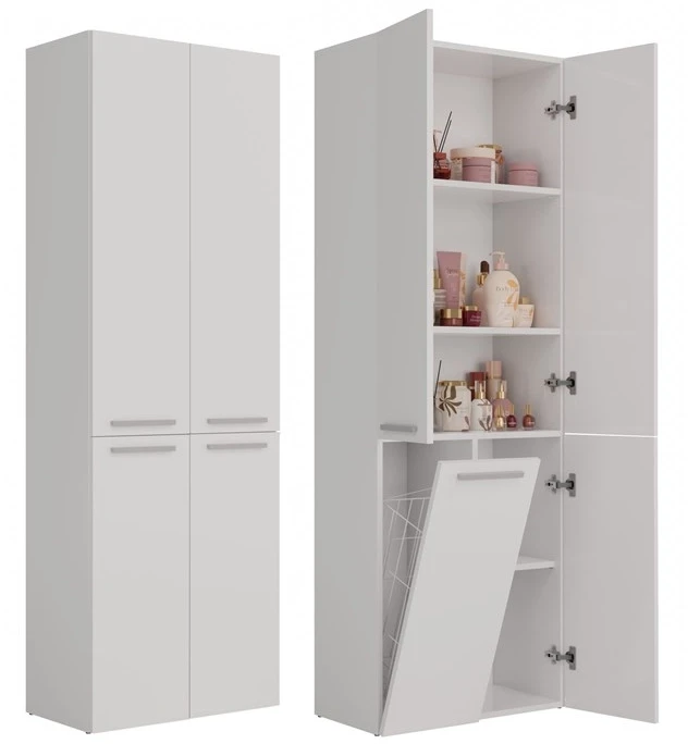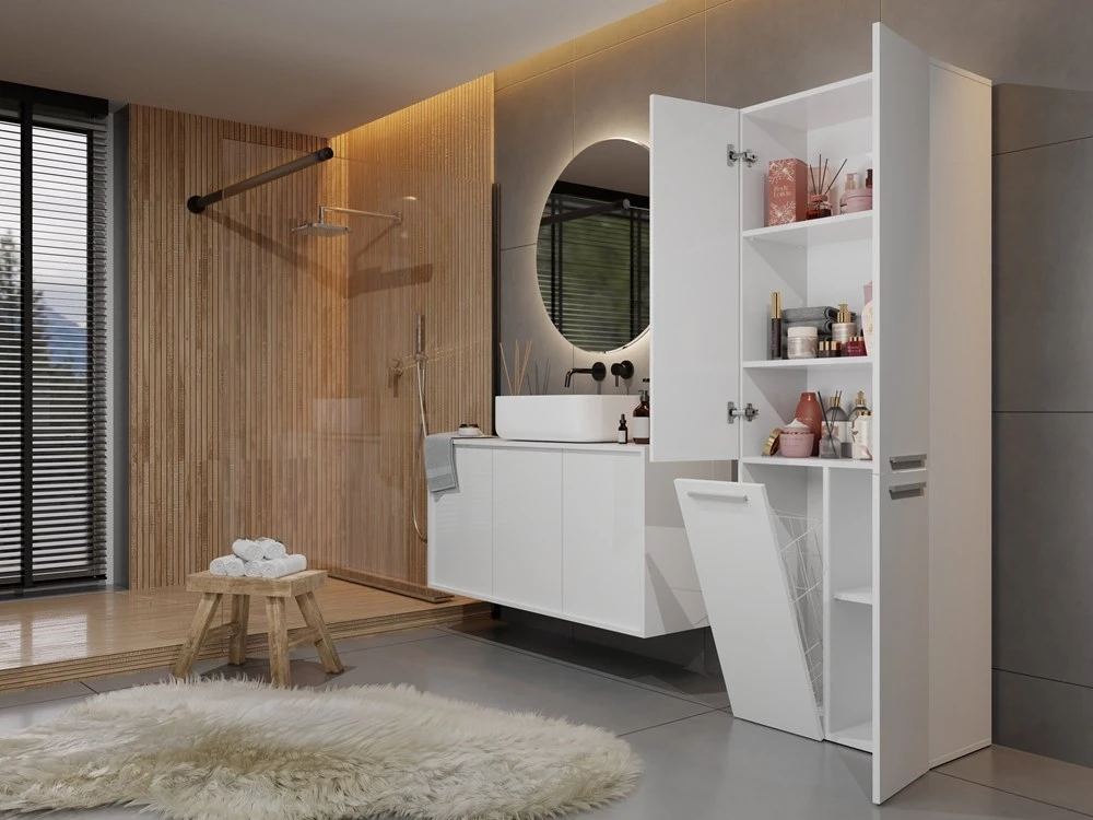 W każdej łazience znajdą się rzeczy, które potrzebują swojego miejsca. Dzięki praktycznym słupkom, skutecznie zapanujesz nad bałaganem, nie zajmując zbyt wiele przestrzeni. Uniwersalny wygląd sprosta oczekiwaniom wszystkich, którzy cenią połączenie prostoty i elegancji. Szafka posiada długie drzwi oraz jeden kosz.
