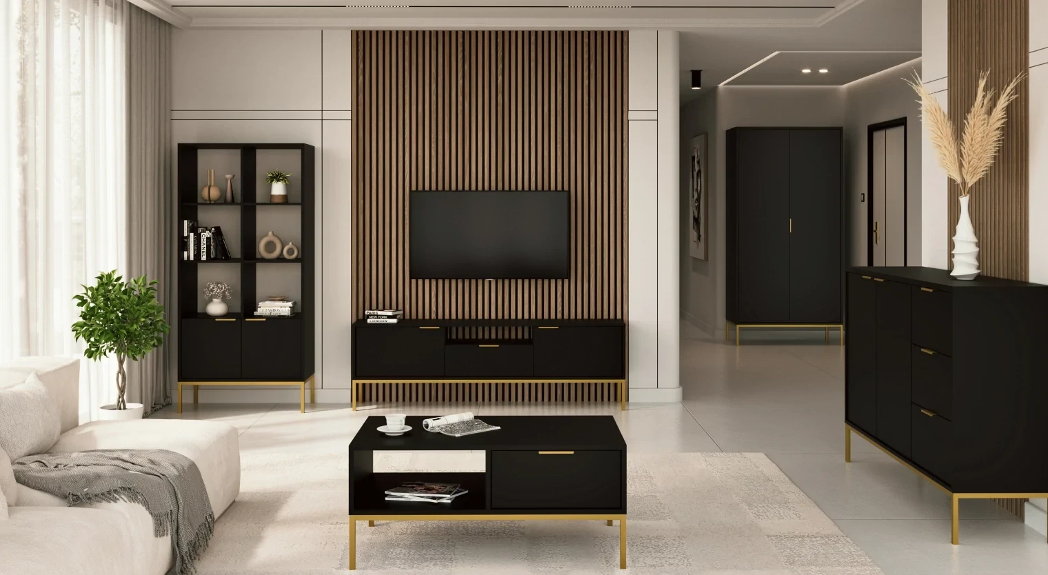 - Wyrafinowany Design: Kontrast czarnego korpusu z detalami w kolorze złotym tworzy harmonijną i nowoczesną kompozycję, która nadaje wnętrzu luksusowego charakteru. Metalowe uchwyty oraz stelaż w złotym odcieniu dodatkowo podkreślają wyjątkowy styl tego mebla.