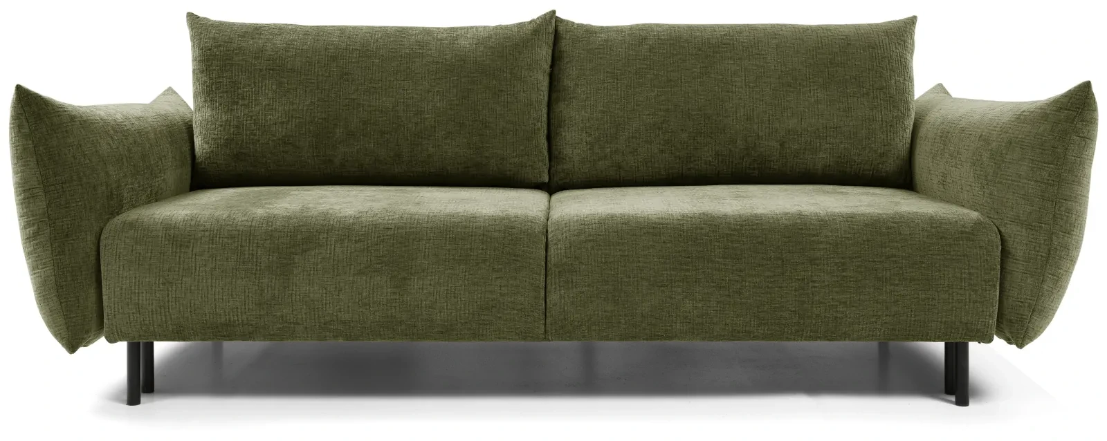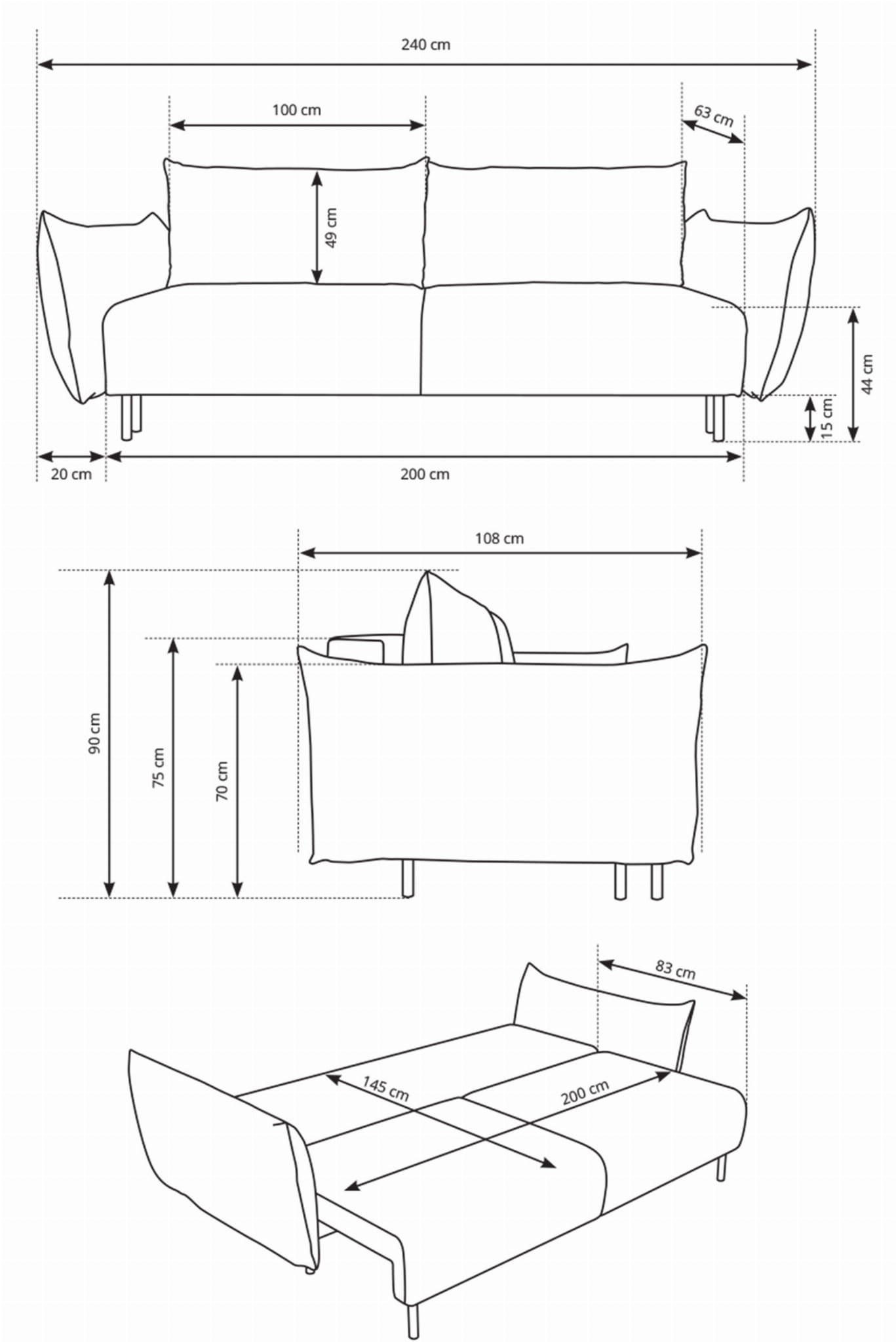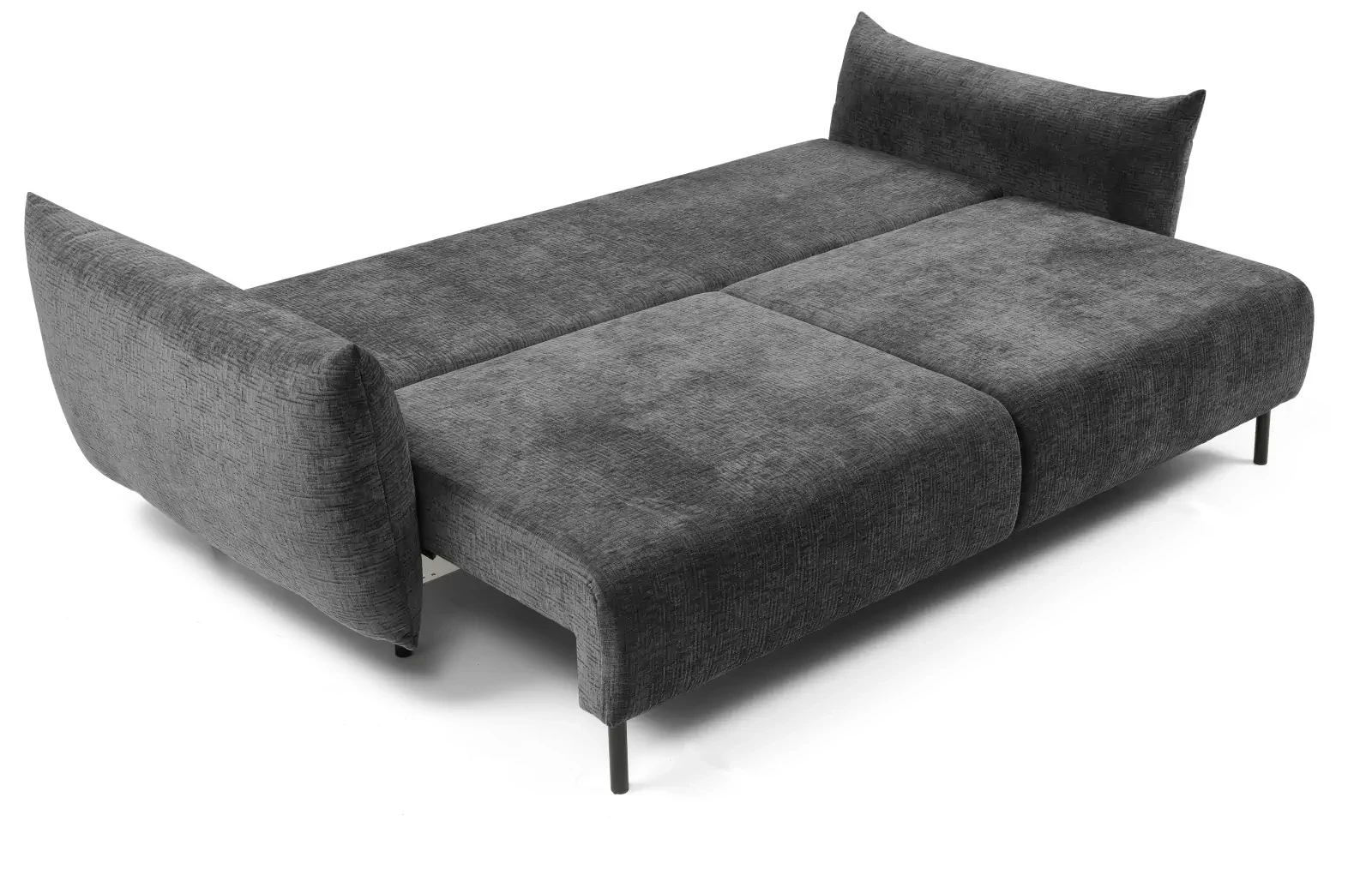 - Przestronność i funkcjonalność – sofa rozkłada się do pełnowymiarowego łóżka o powierzchni spania 145 x 200 cm, zapewniając komfortowy sen dla dwóch osób. Dodatkowo, pojemnik na pościel o wymiarach 197,6 x 67 x 12,5 cm umożliwia praktyczne przechowywanie pościeli i innych akcesoriów.