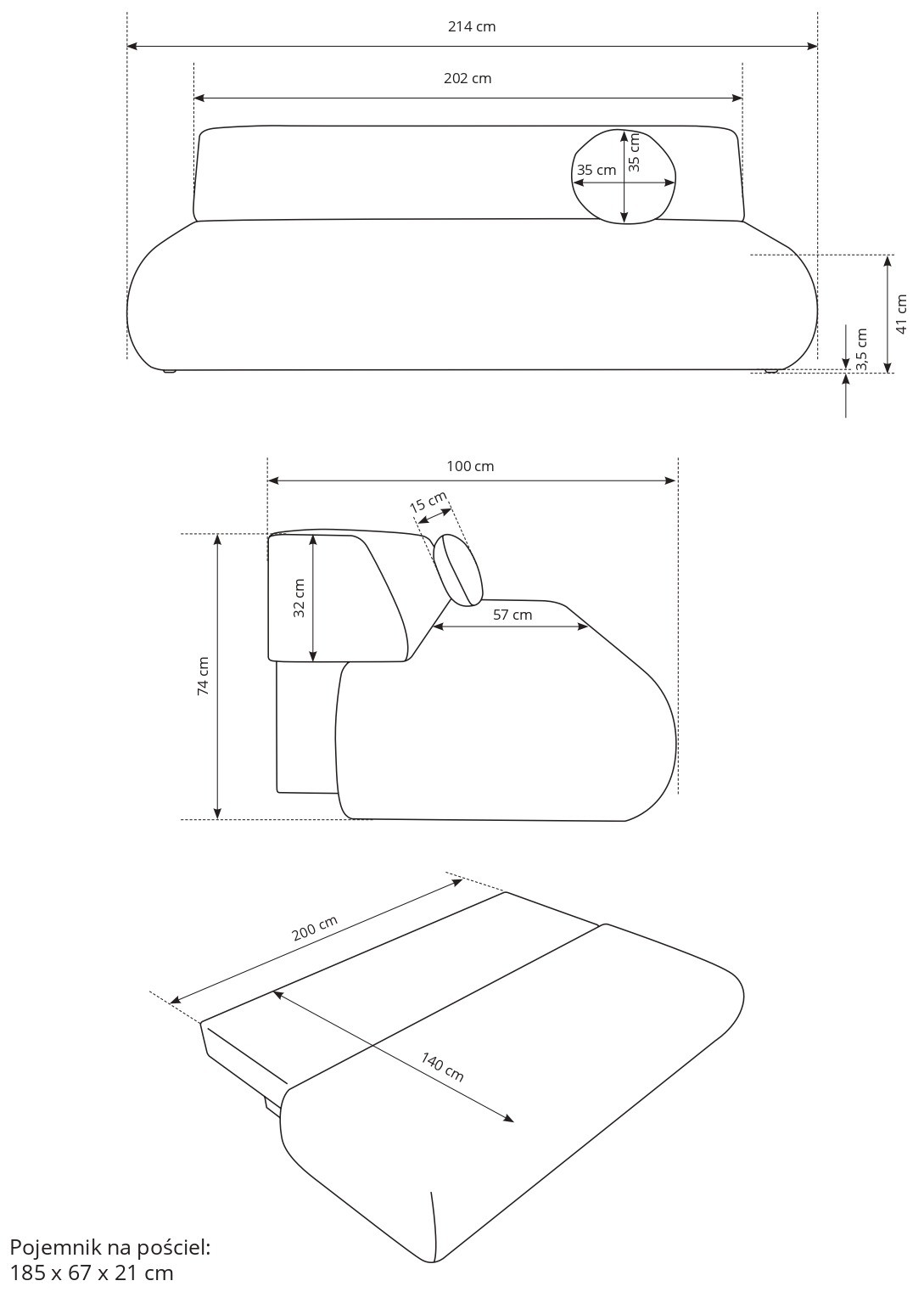 - Pojemnik na pościel: 185 x 67 x 21 cm