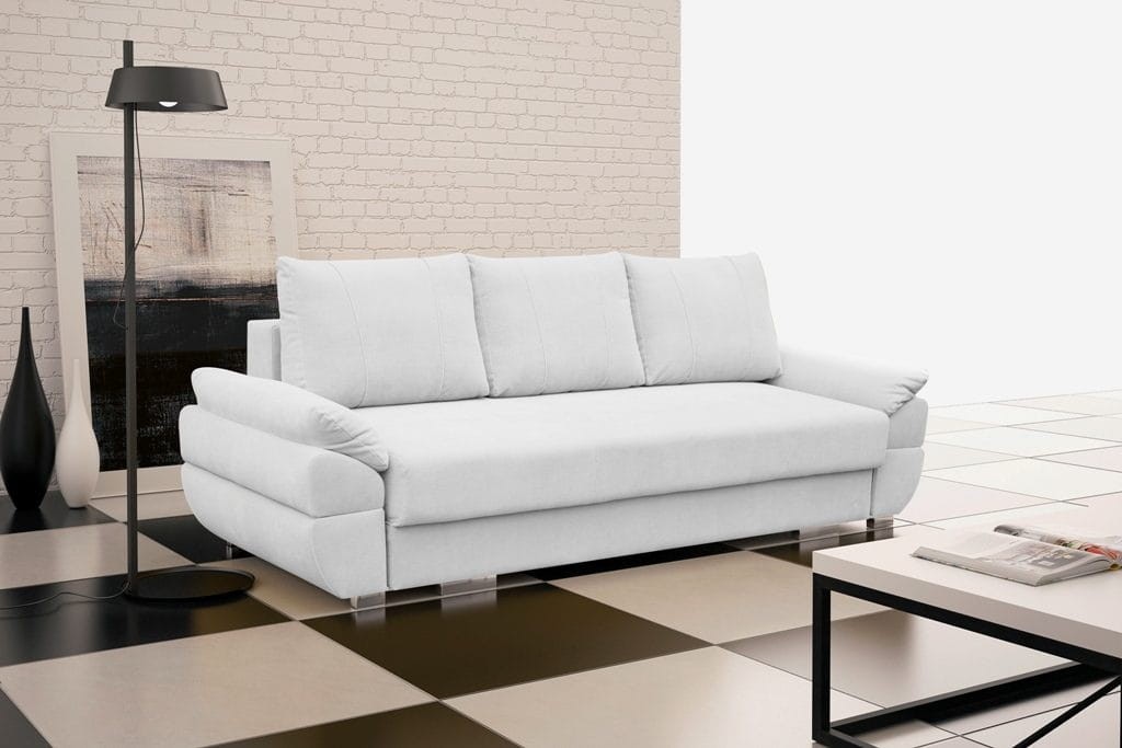 Sofa z funkcją spania Benita to stylowa i komfortowa propozycja rozkładanej kanapy do salonu utrzymanego w nowoczesnym, ponadczasowym stylu. Mebel został zaprojektowany w funkcjonalny i przemyślany sposób oraz wykonany wyłącznie z najlepszych materiałów. Prosta bryła o standardowym dla tego rodzaju mebli rozmiarze pozwala na idealne dopasowanie sofy do każdego pomieszczenia. Benita sprawdzi się zarówno w dużych salonach, jak i w niewielkich mieszkaniach. Solidne niskie nóżki oraz szerokie podłokietniki w połączeniu z elegancką tkaniną idealnie dopełniają kompozycję tego mebla. Oparcie sofy zawiera dodatkowo 3 wygodne poduszki, dzięki którym każdy znajdzie na nim komfortową pozycję. Kanapa wyposażona została w pojemny schowek na pościel, dzięki czemu przechowywanie jej nie będzie stanowiło więcej problemu. Intuicyjny system rozkładania z systemem DL pozwala przekształcić sofę w łóżko o powierzchni spania 197cm na 147cm. Nowoczesna sofą Benita zaprojektowana i wykonana została w Polsce co jest gwarancją jakości - Wspieraj