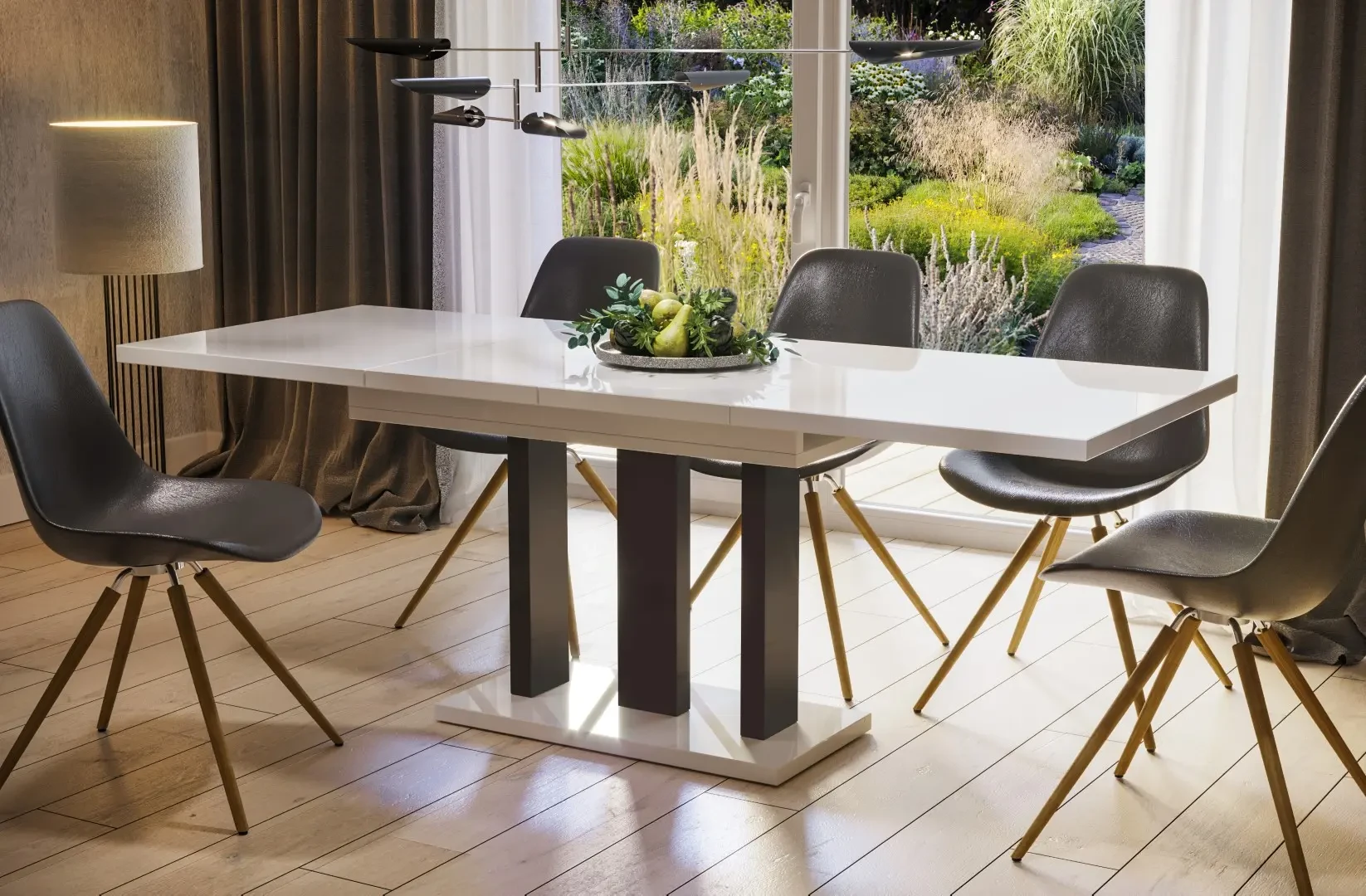 Stół Appia to stylowa i oryginalna propozycja nowoczesnego, rozkładanego stołu do jadalni lub pokoju dziennego. Dzięki opcji rozsuwania, stół można łatwo złożyć i rozłożyć przygotowując go do przyjęcia większej liczby gości. Zastosowanie dwóch wkładek umożliwia wydłużenie stołu do 210 cm pozwalając zmieścić wygodnie 8 osób. Elementy stołu wykonane zostały z wysokiej jakości płyt w kolorze białego połysku i czarnego matu. Stół rozkładany Appia zaprojektowany i wykonany został w Polsce co jest gwarancją jakości - Wspieraj