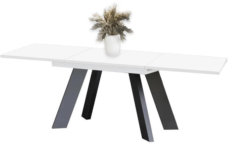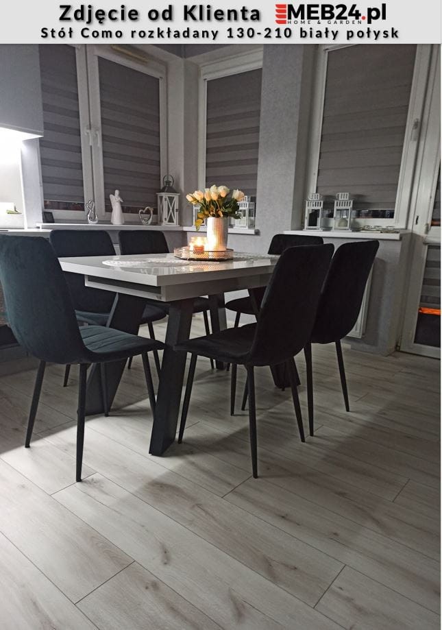 Stół Como to prosta i stylowa propozycja nowoczesnego, rozkładanego stołu do jadalni lub pokoju dziennego. Stół można łatwo złożyć i rozłożyć przygotowując go do przyjęcia większej liczby gości. Zastosowanie dwóch wkładek umożliwia wydłużenie stołu do 210 cm pozwalając zmieścić wygodnie 8 osób. Blat stołu wykonany został z wysokiej jakości płyt w kolorze białego połysku, a cztery nogi w czarnym macie. Stół rozkładany Como zaprojektowany i wykonany został w Polsce co jest gwarancją jakości - Wspieraj