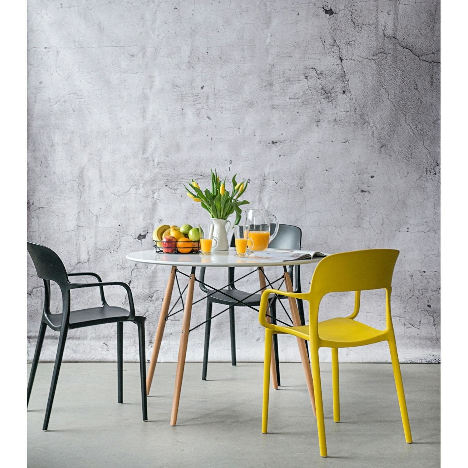 Niezwykły stolik o klasycznej formie. Blat stołu wykonany jest z lakierowanej płyty MDF. Podstawa wykonana jest z drewna bukowego oraz metalowych łączeń lakierowanych na czarno kontrastujących z białym blatem stolika.
