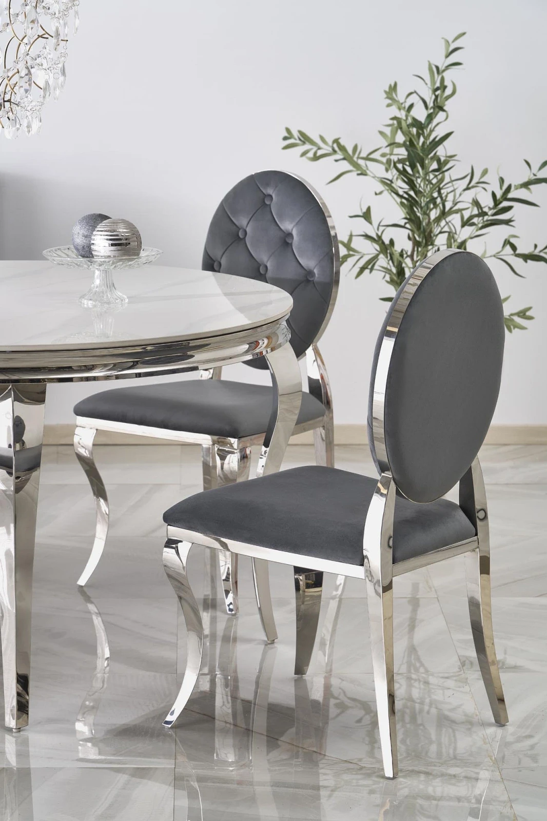 Stół okrągły REGINALD to propozycja dla osób, które poszukują mebla łączącego nowoczesną estetykę z nutą klasycznej elegancji. Jego głównym atutem jest efektowny blat wykonany ze spieku kwarcowego w kolorze białego marmuru – nie tylko piękny wizualnie, ale także wyjątkowo trwały i odporny na zarysowania czy wysoką temperaturę. Konstrukcja oparta na smukłych, giętych nogach ze stali nierdzewnej w połyskującym srebrze dodaje meblowi lekkości i szyku. REGINALD w tej odsłonie doskonale odnajdzie się zarówno w jasnych, minimalistycznych wnętrzach, jak i tych urządzonych w stylu glamour czy modern classic. Dzięki okrągłej formie, mebel sprzyja integracji i zapewnia wygodę podczas wspólnych posiłków – to idealne rozwiązanie do salonu, jadalni lub przestrzeni komercyjnej. Jego solidne wykonanie gwarantuje wieloletnie użytkowanie, a dopracowane detale podnoszą estetykę każdego wnętrza.