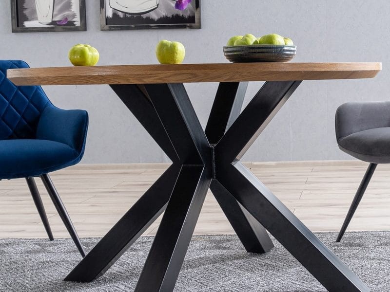 Stół Ritmo to nietuzinowa propozycja mebla do wnętrz zarówno nowoczesnych, jak i klasycznych. Stół jest centralnym elementem każdej jadalni, dlatego należy zwrócić uwagę na jego interesujący i przyciągający wzrok wygląd. Model Ritmo łączy w sobie piękny design i funkcjonalność. Blat stołu o średnicy 120 cm wykończony okleiną w kolorze dąb i umieszczony na czterech metalowych nogach zbiegających się w połowie wysokości. Całość tworzy przyciągającą wzrok formę nadającą charakteru każdemu pomieszczeniu.