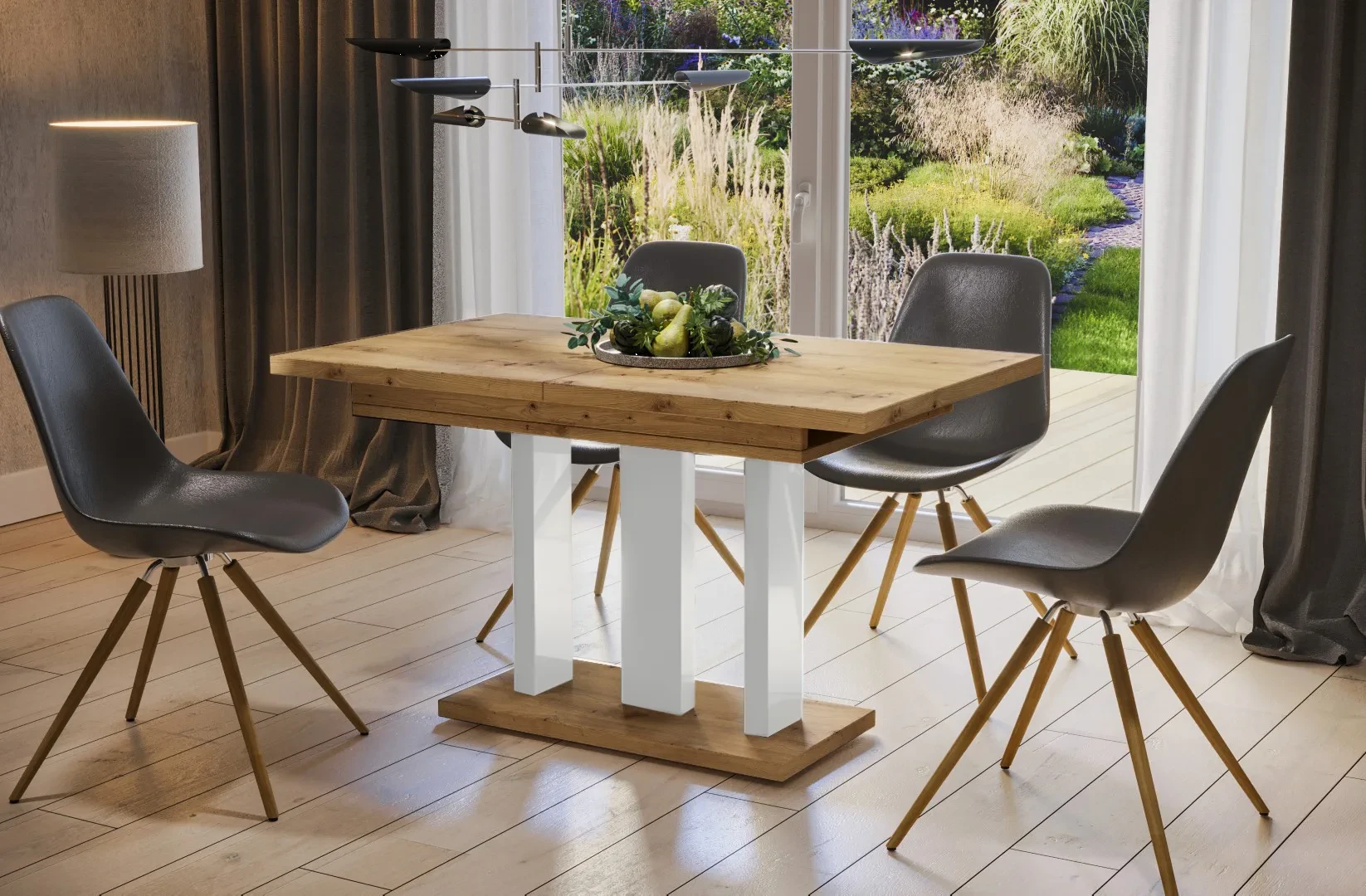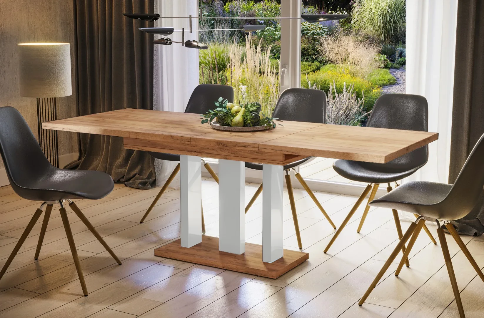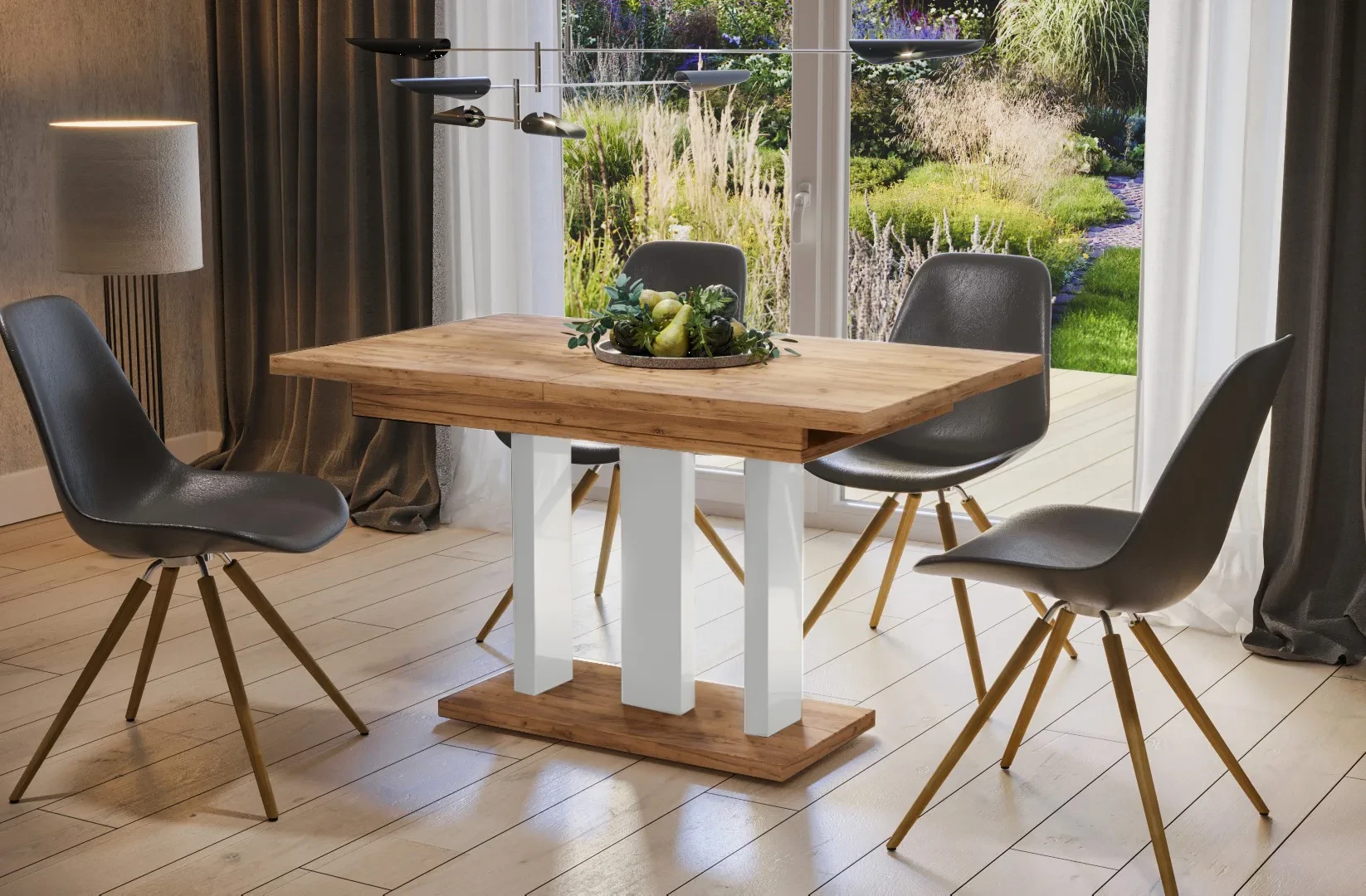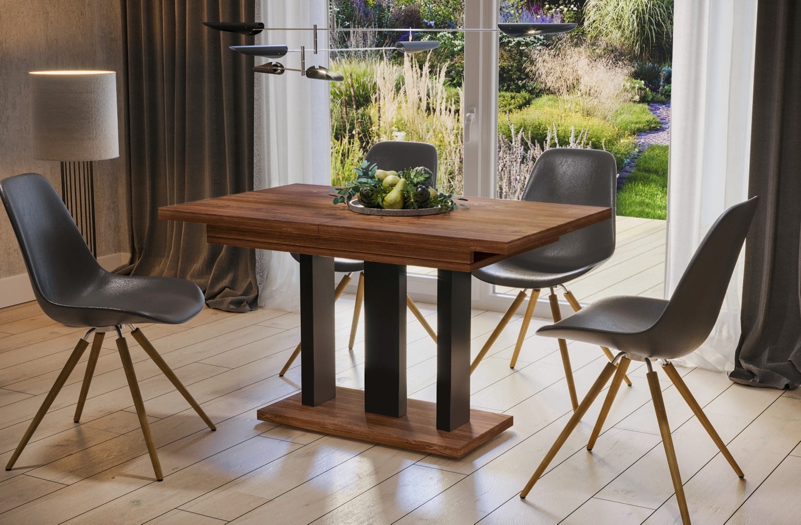 - stół posiada opcję rozsuwania z wkładkami chowanymi pod blatem