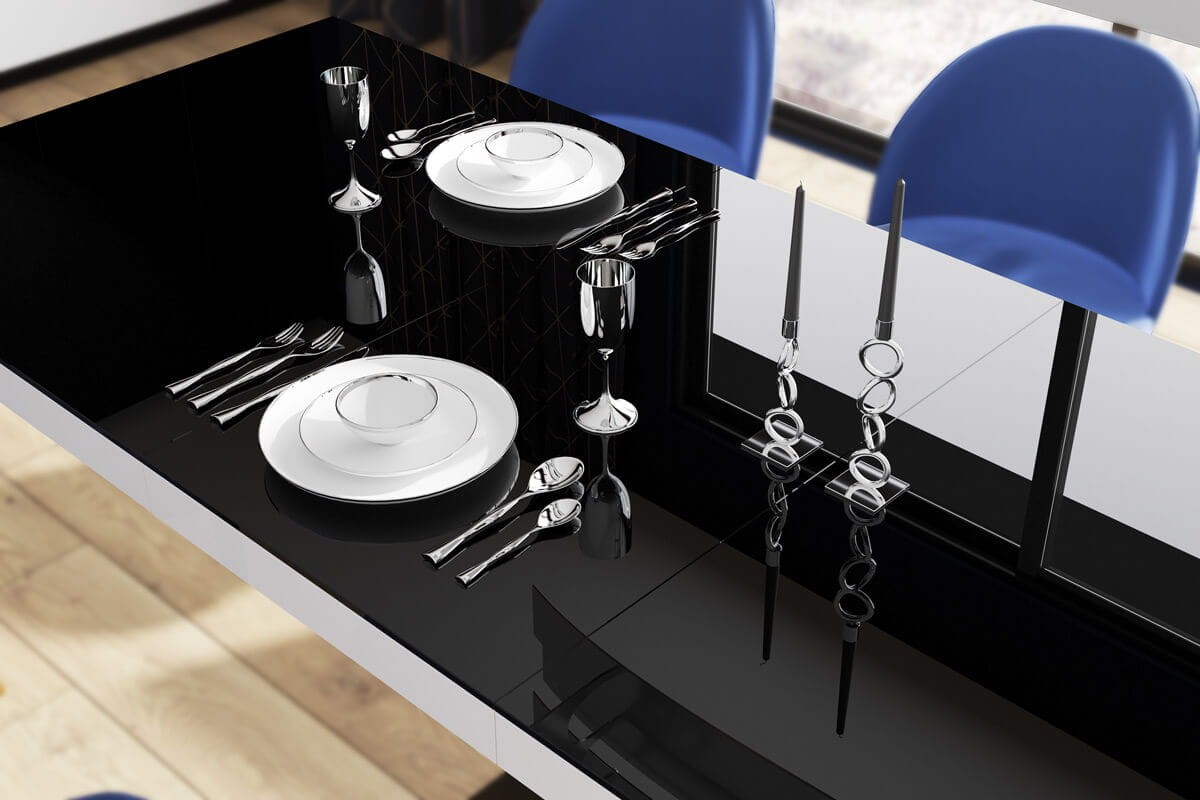 - Czarno-biały supermat / Nogi mieszane (wierzch blatu oraz podstawa w macie, rant blatu oraz noga w połysku)