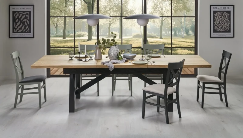 Stół FIESTA to doskonała propozycja dla tych, którzy szukają nie tylko mebla do jadalni, ale i centralnego punktu spotkań rodzinnych oraz towarzyskich. Dzięki funkcji rozkładania z łatwością dostosujesz jego wielkość do bieżących potrzeb – od codziennego użytku po większe uroczystości. Naturalny odcień blatu w połączeniu z kontrastującymi czarnymi nogami tworzy stylową i nowoczesną kompozycję, która odnajdzie się zarówno w klasycznych, jak i loftowych wnętrzach. Solidna konstrukcja oparta na litej drewnianej podstawie gwarantuje trwałość przez lata, a dębowe lamele na blacie dodają szlachetnego charakteru. FIESTA to stół, który łączy piękno naturalnych materiałów z maksymalną praktycznością, wnosząc do wnętrza harmonię i elegancję.