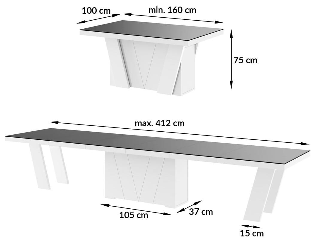 Stół Grande 160 to kwintesencja praktycznego designu i elegancka propozycja praktycznego stołu do salonu umożliwiającego przekształcenie go w prosty sposób w pełnowymiarowy stół do jadalni. Prosta, nowoczesna forma połączona z eleganckim wyglądem i wysoką funkcjonalnością. Blat główny opiera się na szerokiej kolumnie, która w środku wyposażona jest w schowek na dodatkowe blaty powiększające oraz na 4 dodatkowych nogach ułożonych pod skosem w kształt litery V. Stół został zaprojektowany jako największy dostępny na rynku stół, rozkładający się od 160 cm do maksymalnie 412 cm. Po rozłożeniu przy stole Grande zmieści się aż 18 gości. Wpasowując się w nowoczesne trendy, a także dla zachowania odpowiednich proporcji stołu, blat został pogrubiony.