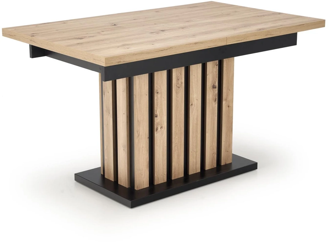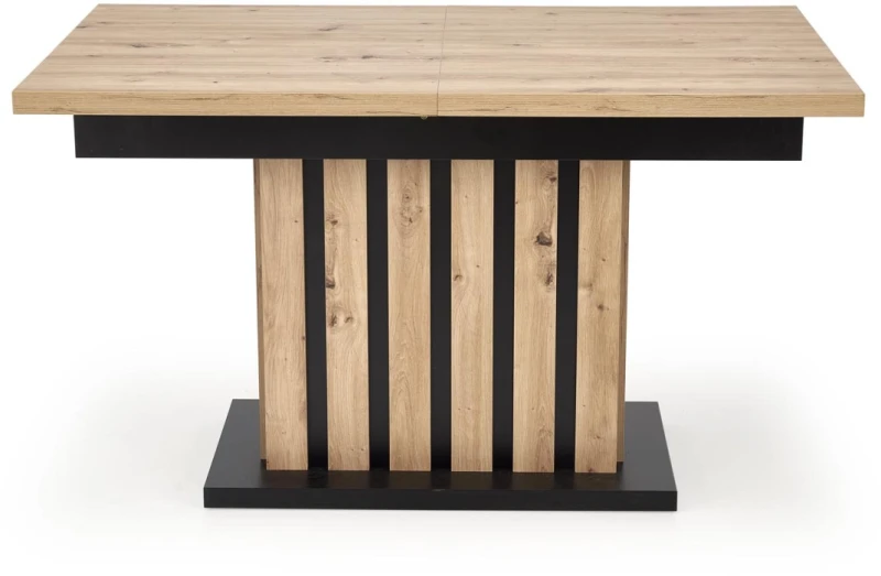 Stół LAMELLO to stylowe połączenie funkcjonalności i elegancji, które doskonale odnajdzie się w nowoczesnych wnętrzach. Jego rozkładana konstrukcja pozwala dopasować powierzchnię blatu do liczby gości i aktualnych potrzeb, czyniąc go idealnym rozwiązaniem zarówno na co dzień, jak i podczas rodzinnych spotkań. Blat w odcieniu dąb artisan w zestawieniu z czarną podstawą tworzy wyjątkowo elegancką i modną kompozycję. Charakterystyczne lamelki na masywnej nodze podkreślają nowoczesny styl i nadają całości niepowtarzalnego charakteru.