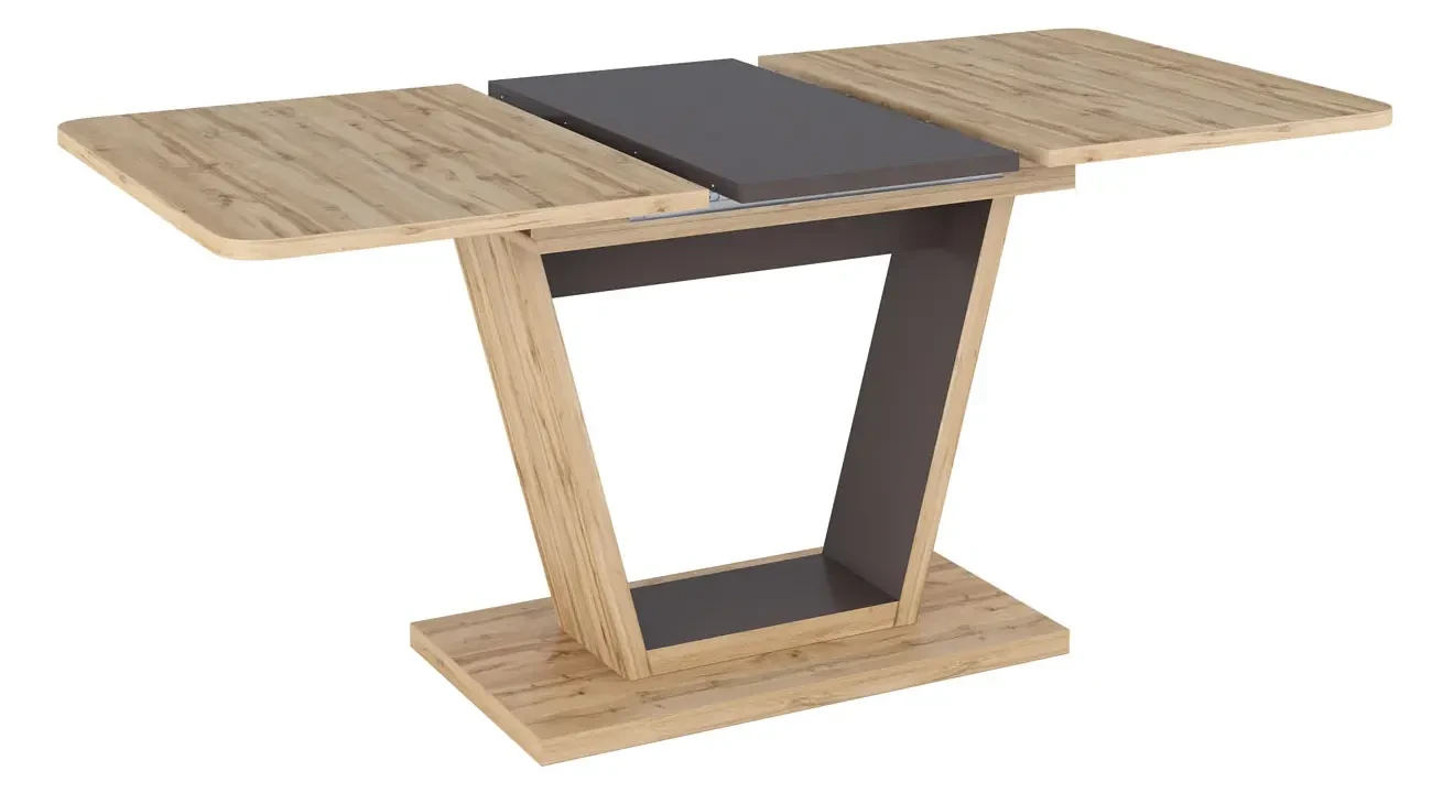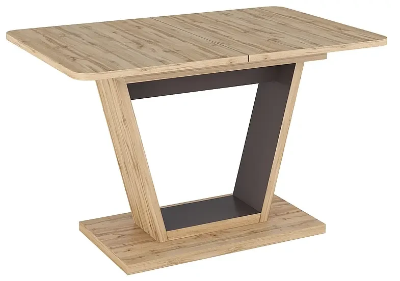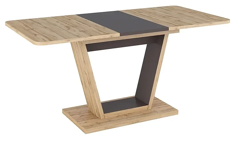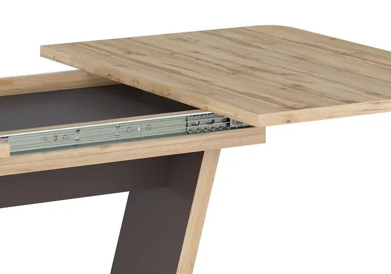 Stół Nigel to nowoczesny mebel o stylowym designie, który doskonale pasuje zarówno do jadalni, jak i pokoju dziennego. Jego główną zaletą jest możliwość rozkładania, dzięki czemu łatwo dostosować jego rozmiar do liczby gości. Stół może zostać rozłożony aż do długości 160 cm, zapewniając wygodne miejsce dla nawet 8 osób. Stół wykonany jest z wysokiej jakości płyty laminowanej, zarówno blat, jak i stelaż. Stała część blatu i stelaż mają elegancki kolor dębu wotan, podczas gdy dodatkowy blat oraz część stelaża posiadają interesujący odcień brązu. Solidna konstrukcja stelaża gwarantuje stabilność i trwałość mebla. Dodatkowym praktycznym rozwiązaniem jest dostawka, która może zostać schowana pod blatem, umożliwiając wygodne przechowywanie, gdy nie jest używana. Dzięki temu stół Nigel zachowuje schludny wygląd. Stół nie tylko zachwyca funkcjonalnością, ale również estetyką. Naturalne połączenie kolorów dębu wotan i brązowego dodatku nadaje mu nowoczesny i świeży wygląd. Dodatkowo, laminowany materiał jest łatwy do utrzymania w czystości, co sprawia, że stołowanie się przy stole Nigel będzie przyjemne i komfortowe.
