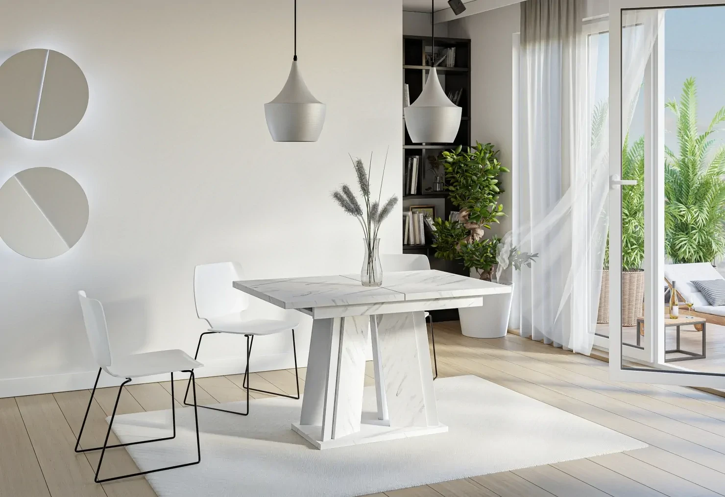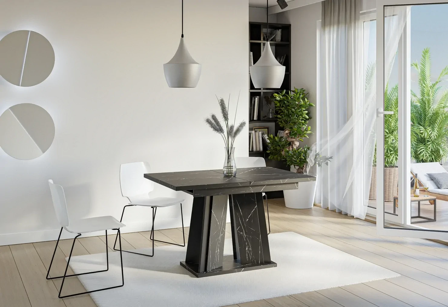 - Nowoczesny design: Prostokątny blat i podstawa w kształcie odwróconej litery "V" nadają stołowi unikalny charakter, który pasuje zarówno do nowoczesnych, jak i bardziej klasycznych wnętrz. Szeroki wybór wariantów kolorystycznych umożliwia dopasowanie stołu do każdej aranżacji.