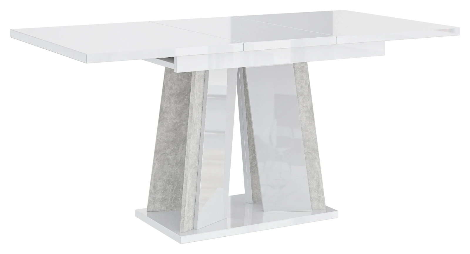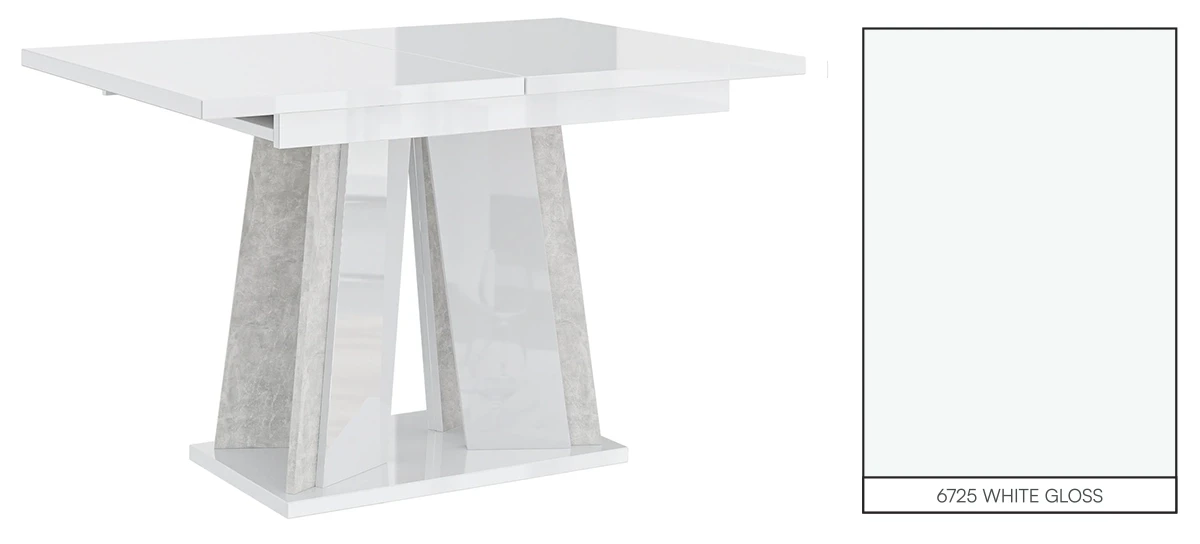 - Blat i nogi w wersjach WHITE GLOSS (biały arktyczny połysk) i BLACK GLOSS (czarny połysk): Płyta meblowa akrylowa wysoki połysk z elementami w kolorze light atelier stone (beton) wykonanymi z płyty laminowanej.