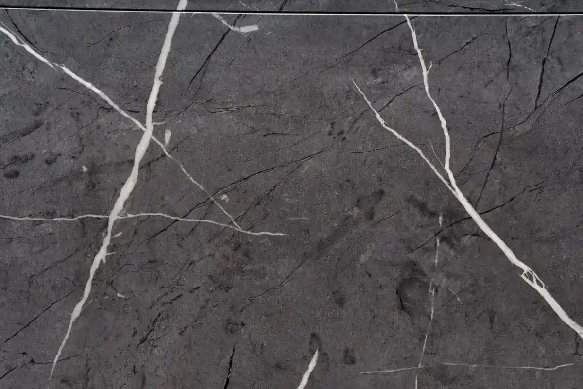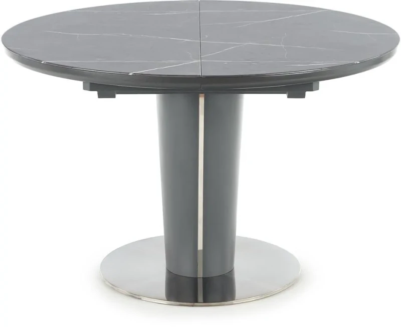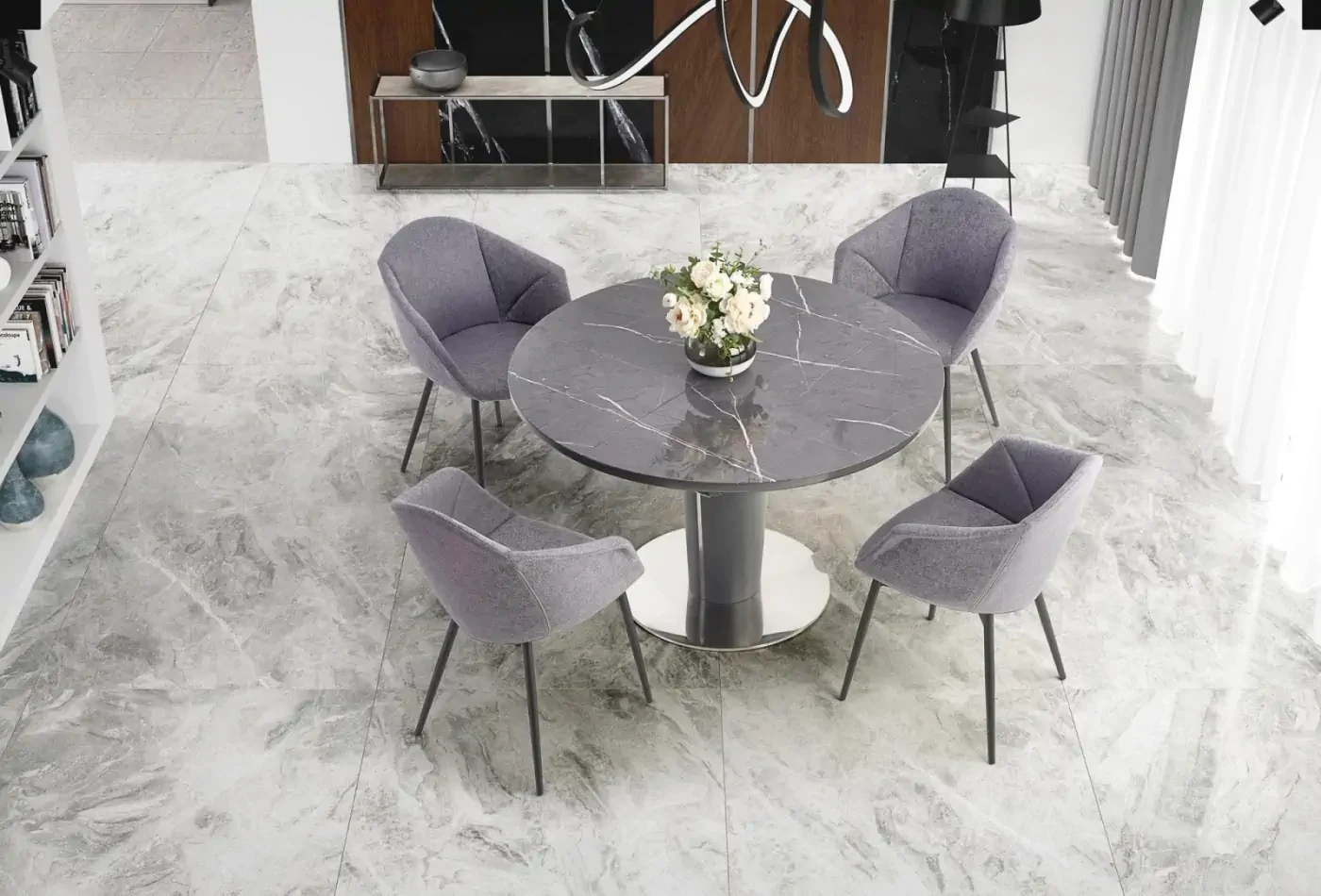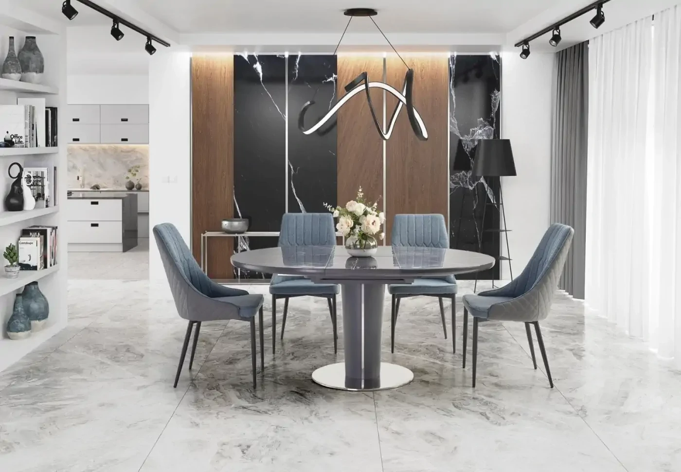 Stół Ricardo to elegancki i praktyczny mebel, który doskonale sprawdzi się w nowoczesnych wnętrzach jadalni lub salonu. Połączenie blatu w wykończeniu popielatego marmuru z solidną, metalową podstawą w ciemnopopielatym kolorze tworzy efektowny i harmonijny duet. Dzięki funkcji rozkładania stół z łatwością dostosujesz do liczby gości – w kilka chwil zmienisz kompaktowy mebel w przestronny blat, idealny na rodzinne spotkania. Wysoki połysk i jakość wykończenia podkreślają jego nowoczesny charakter, dodając wnętrzu szyku i elegancji.