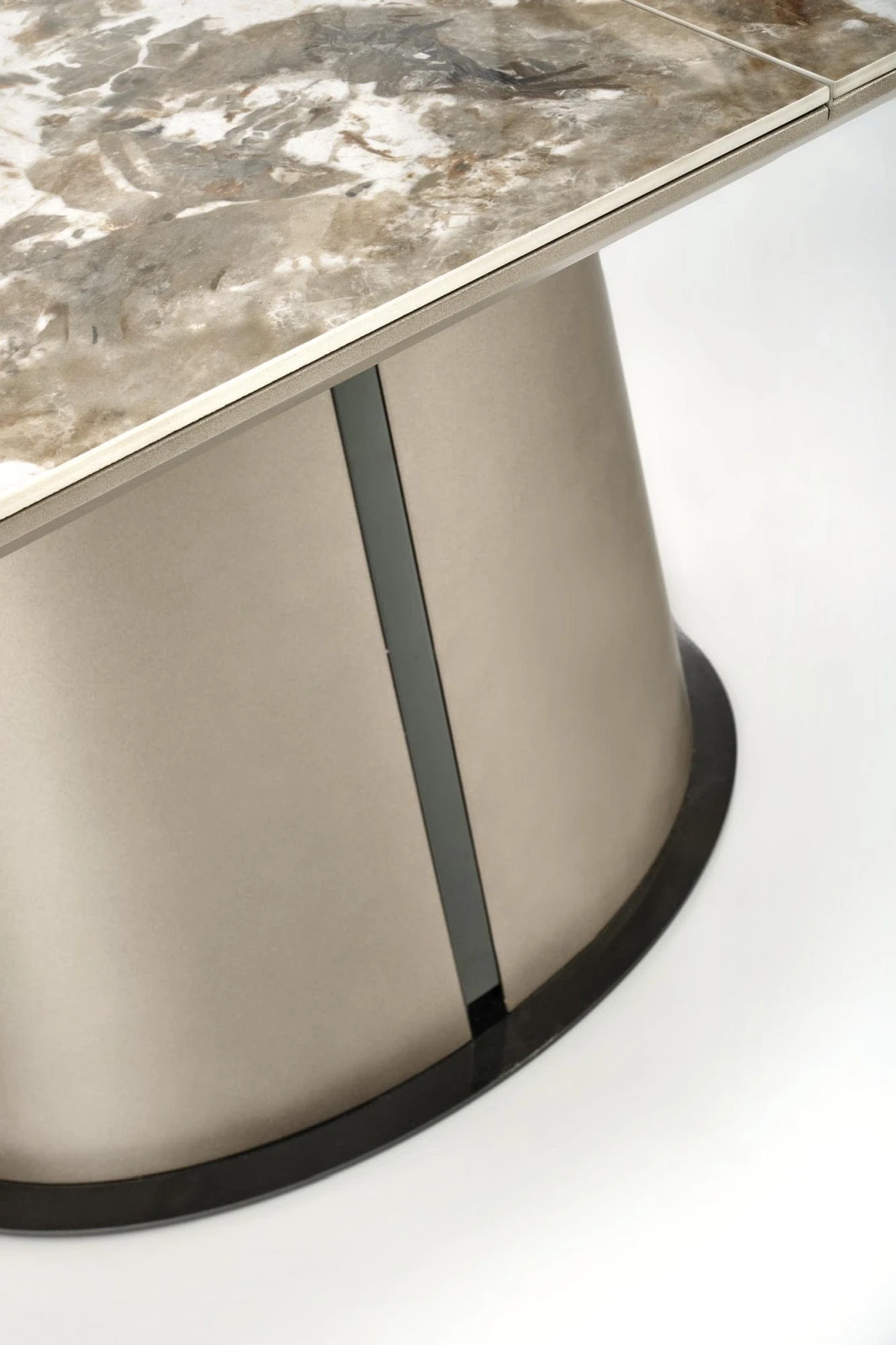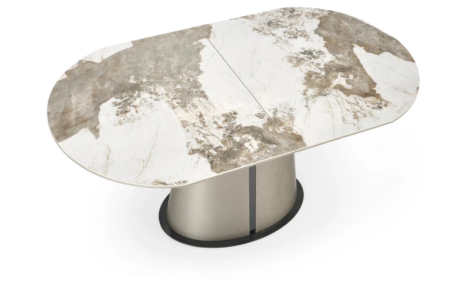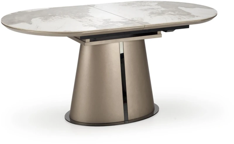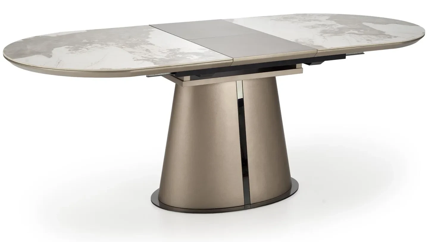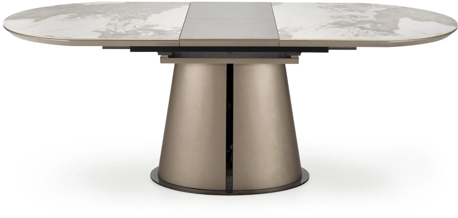 Stół ROBINSON to wyrafinowane połączenie estetyki i funkcjonalności, które idealnie sprawdzi się w nowoczesnych i eleganckich wnętrzach. Jego blat, wykonany z ceramiki o wyglądzie beżowego marmuru, zachwyca subtelnym wzorem i wysoką odpornością na zarysowania oraz temperaturę. To nie tylko stylowy akcent, ale również praktyczne rozwiązanie na co dzień. Mechanizm rozkładania umożliwia szybkie powiększenie powierzchni stołu z 160 cm do aż 200 cm, co czyni go idealnym wyborem na rodzinne spotkania czy kolacje z przyjaciółmi. Całość osadzona jest na stabilnej, dekoracyjnej nodze w kolorze cappuccino z czarnym akcentem, wykonanej z malowanej proszkowo stali – dzięki temu mebel nie tylko zachwyca designem, ale i solidnością. ROBINSON to stół, który łączy nowoczesną elegancję z ponadczasową trwałością.