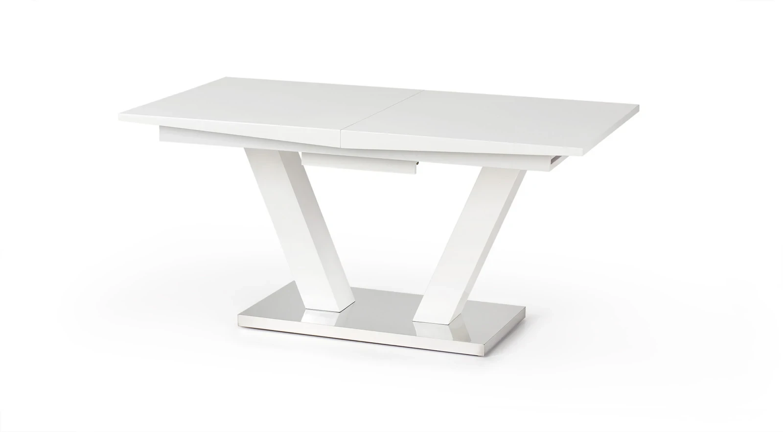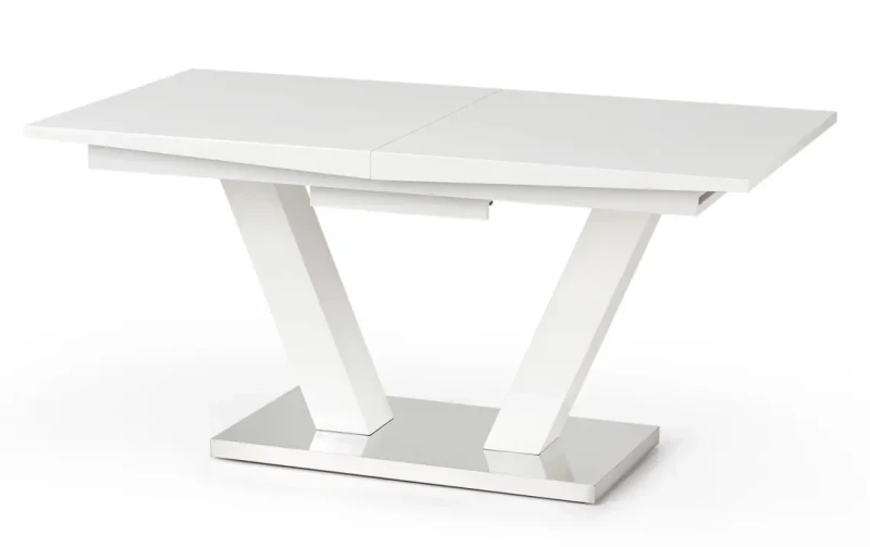 Stół VISION to elegancki mebel zaprojektowany z myślą o nowoczesnych wnętrzach utrzymanych w stylu glamour. Biały, lakierowany na wysoki połysk blat z płyty MDF w połączeniu ze stalową, błyszczącą podstawą tworzy wyjątkowo stylowy efekt wizualny. Dzięki funkcji rozkładania blat można z łatwością powiększyć z 160 do 200 cm, co pozwala wygodnie pomieścić nawet 8 osób.