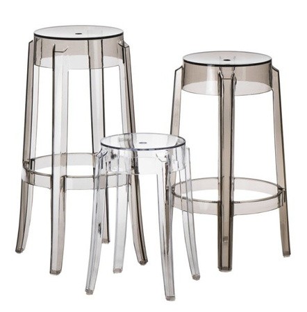 Przezroczysty stołek. Nie zajmuje miejsca w przestrzeni. Nadaje się do,użytku zewnętrznego i wewnętrznego. Jest idealnym uzupełnieniem kolekcji krzeseł transparentnych.