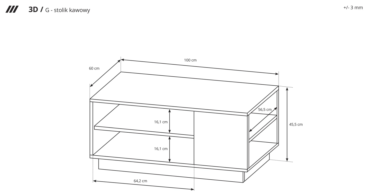 Minimalistyczny stolik kawowy 3D to praktyczny mebel do salonu, utrzymany w stylu modernistycznym. Stolik idealnie sprawdzi się w mniejszych lub średnich salonach i pokojach wypoczynkowych. Wyposażony został w półki pod blatem oraz jest osadzony na cokole. Ława 3D to estetyczne połączenie nowoczesności z klasycznymi rozwiązaniami. Mebel utrzymany jest w stonowanej stylistyce i wykonany został z wysokiej jakości płyty laminowanej. Mebel został zaprojektowany i wykonany w Polsce co jest gwarancją jakości - Wspieraj