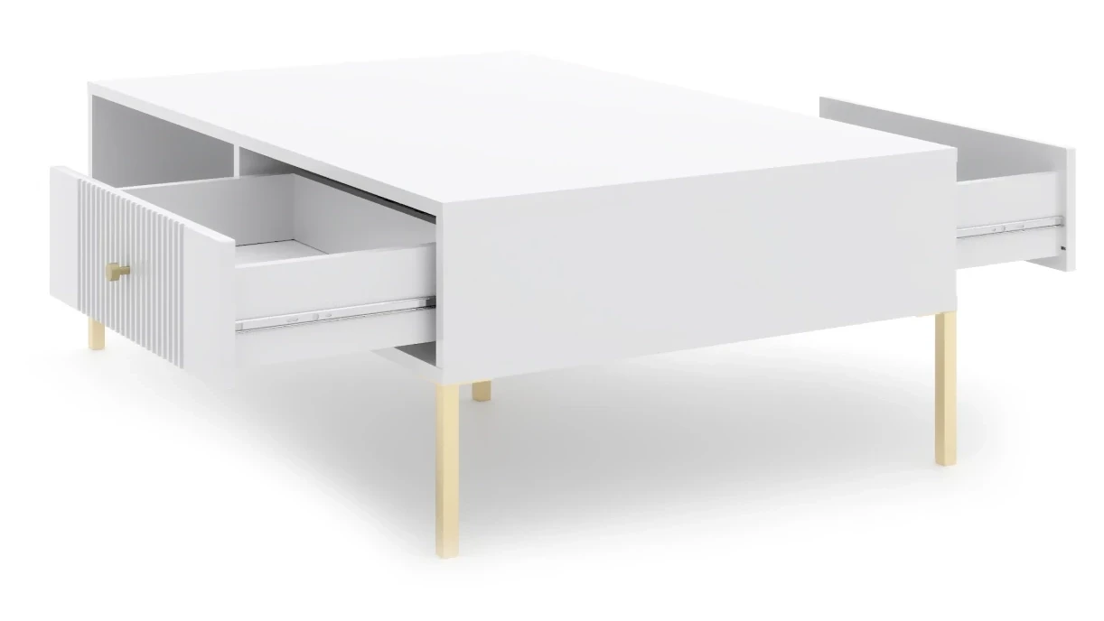 Stolik kawowy Iseo 104 cm z 2 frezowanymi szufladami biały/złote nogi