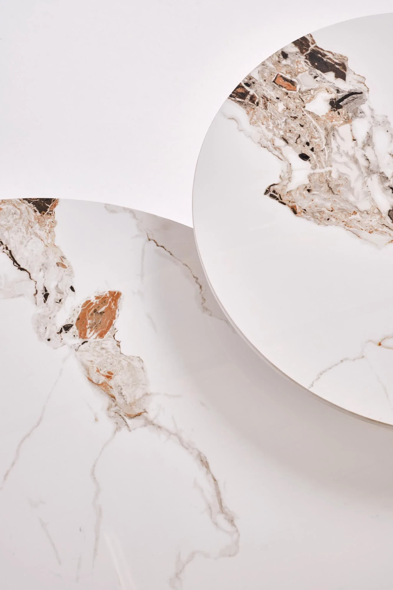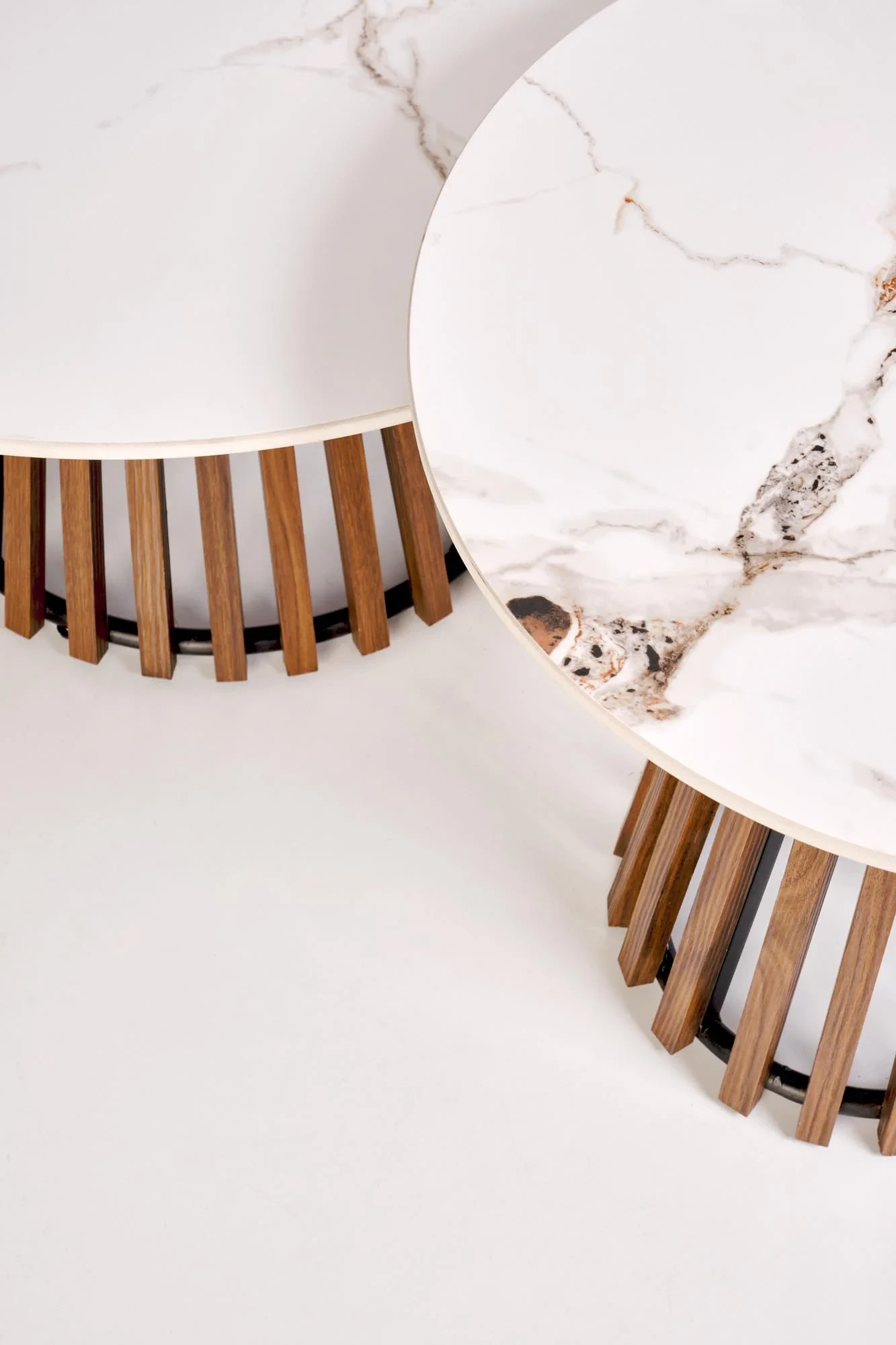 CARINA_S to elegancka ława w nowoczesnym stylu, która łączy efektowny blat w wykończeniu beżowego marmuru z ciepłym odcieniem orzechowego stelaża. Okrągła forma i połysk blatu nadają jej lekkości oraz subtelnej elegancji, dzięki czemu doskonale odnajdzie się w salonie, strefie wypoczynkowej czy nowoczesnym gabinecie.