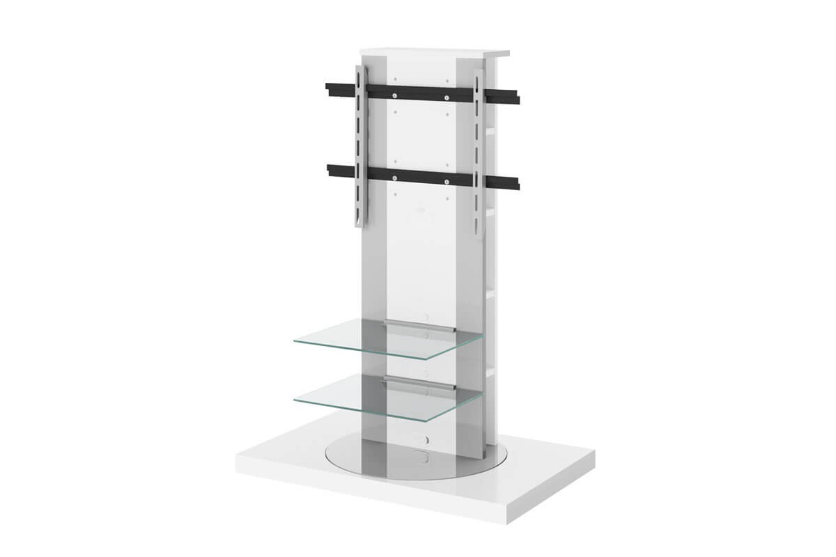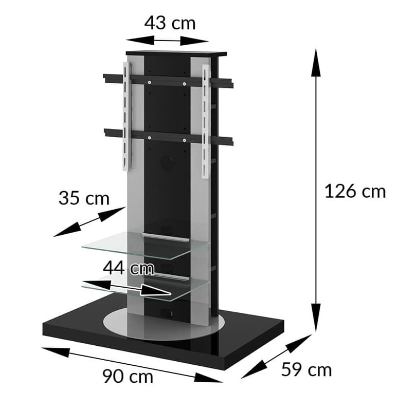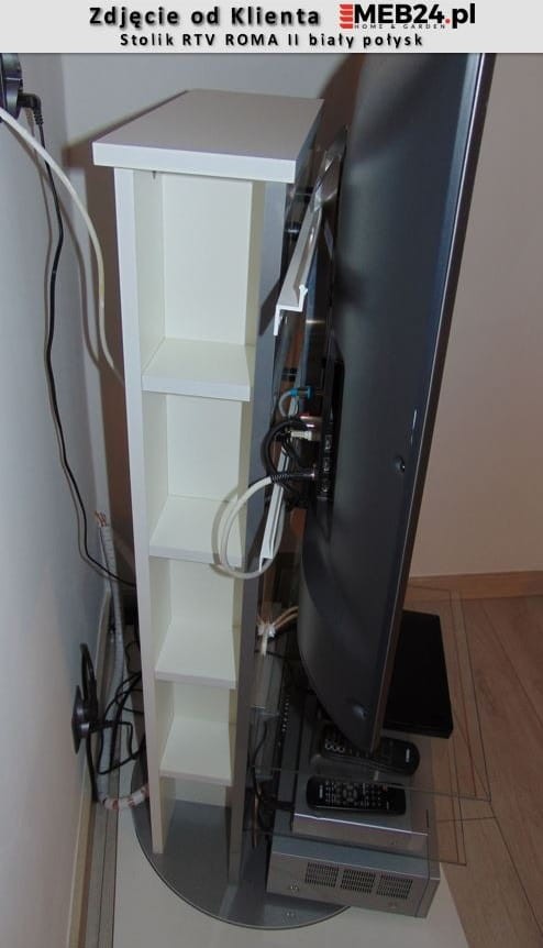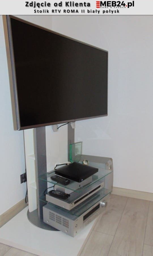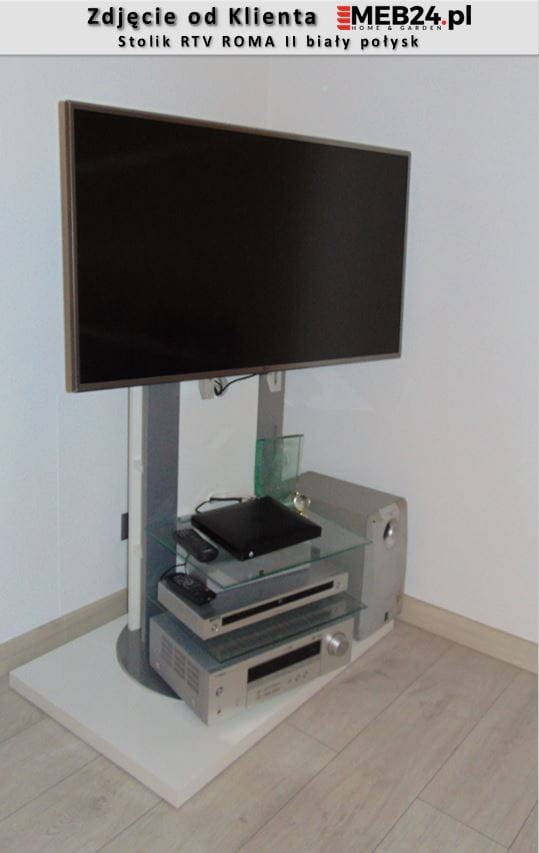 Stolik RTV ROMA 2 to niezwykle oryginalny i elegancki stolika pod telewizor. Wyróżnia go nowoczesny design i funkcjonalność. Stolik wyposażony jest w dwie szklane półki przeznaczone do przechowywania sprzętu oraz obrotowy (360 stopni) słupek/wieszak do powieszenia TV (max.55’), z obustronnym miejscem do przechowywania płyt CD oraz z miejscem do ukrycia przewodów.