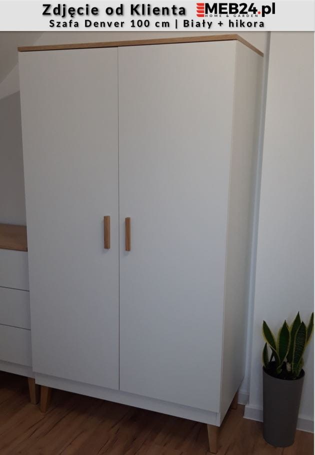 Szafa Denver utrzymana jest w stonowanej, nowoczesnej stylistyce i wykonana została z wysokiej jakości płyty laminowanej, która dodatkowo zabezpieczona została obrzeżem PCV. Sprawia to, iż mebel odporny jest na uszkodzenia mechaniczne i wilgoć, a jego zakup będzie inwestycją na długie lata. Nogi, tak jak i ergonomiczne uchwyty, wykonane są z lakierowanego litego drewna dębowego. Solidna budowa gwarantuje trwałość oraz bezpieczeństwo użytkowania. Szafa Denver dostępna jest w dwóch wariantach kolorystycznych: biały + hikora oraz szary chinchilla & hikora.
