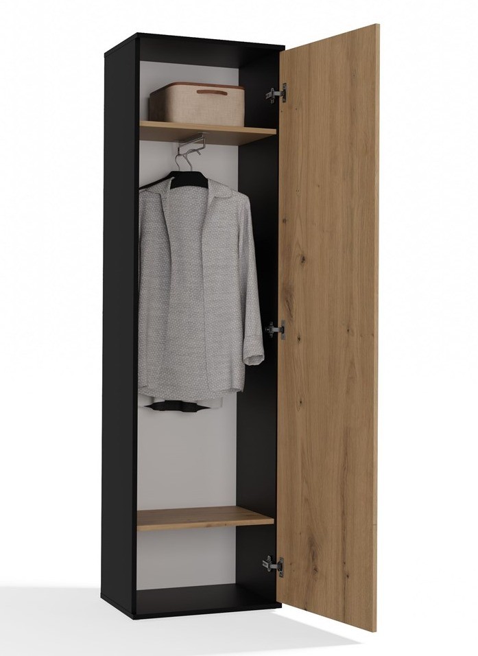 - Przemyślane wnętrze - dwie praktyczne półki i uchwyt na wieszaki pozwalają wygodnie przechowywać zarówno odzież wiszącą, jak i akcesoria.