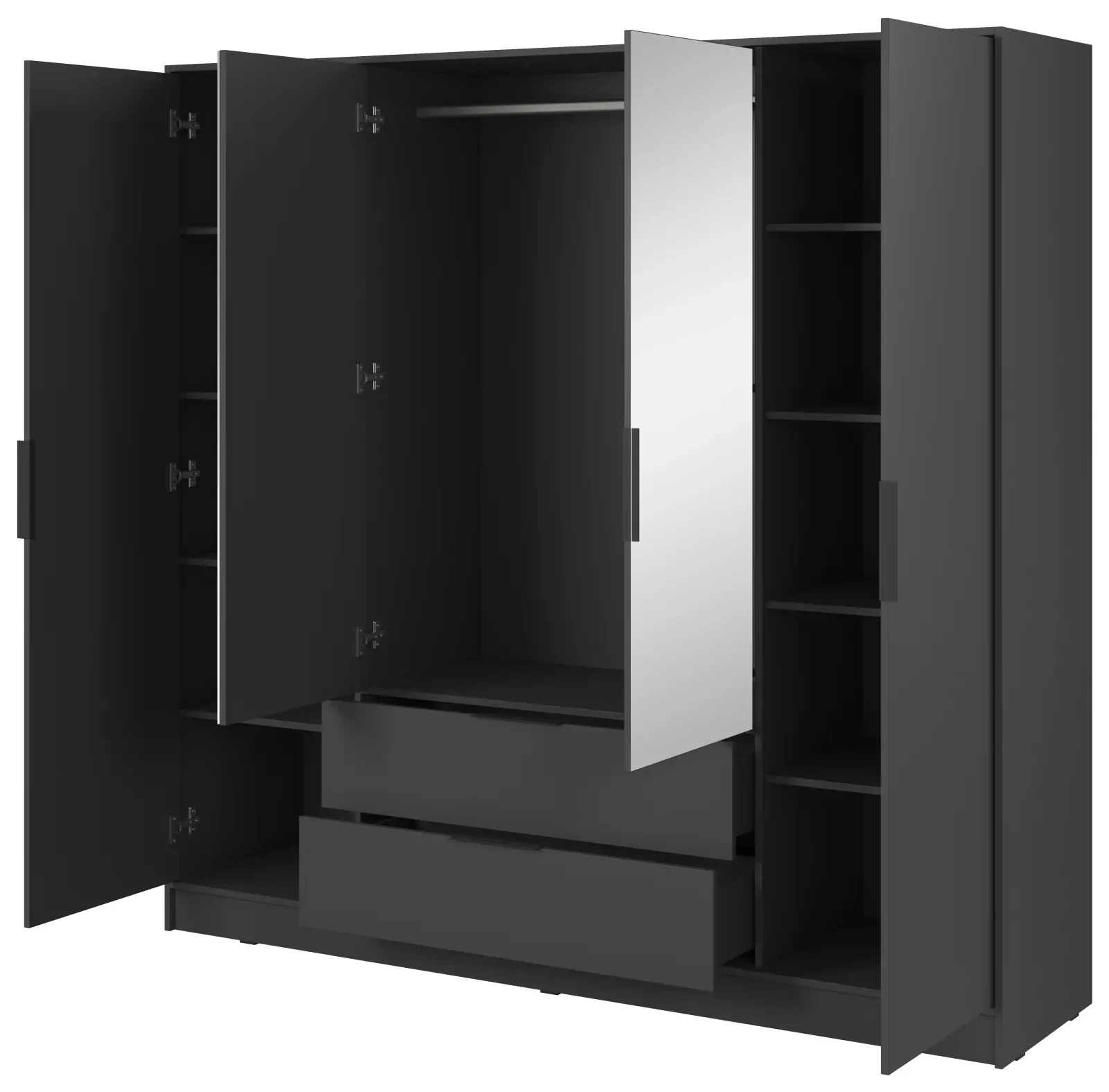 - Wbudowane lustro – dwa środkowe drzwi z lustrem podkreślają nowoczesny design oraz optycznie powiększają przestrzeń, dodając wnętrzu elegancji.