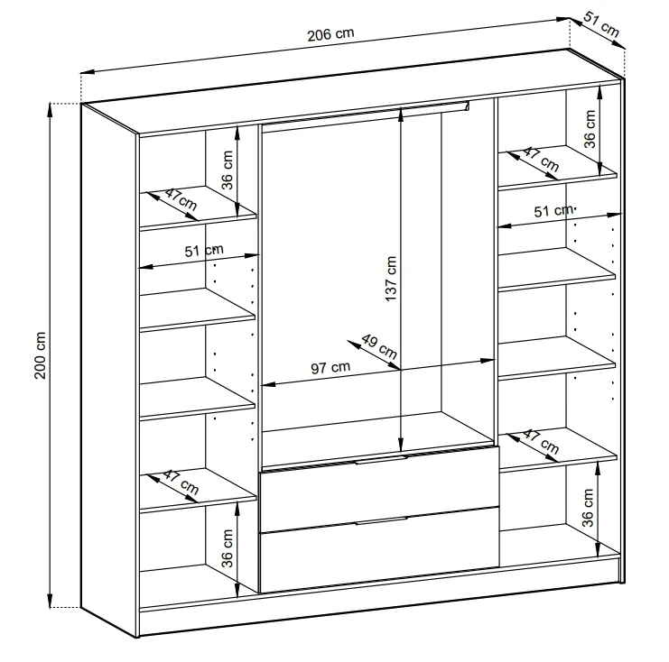 - Funkcjonalne wnętrze – szafa wyposażona w 8 półek, drążek na ubrania oraz dwie szuflady, co pozwala na łatwe przechowywanie ubrań, akcesoriów oraz innych przedmiotów.
