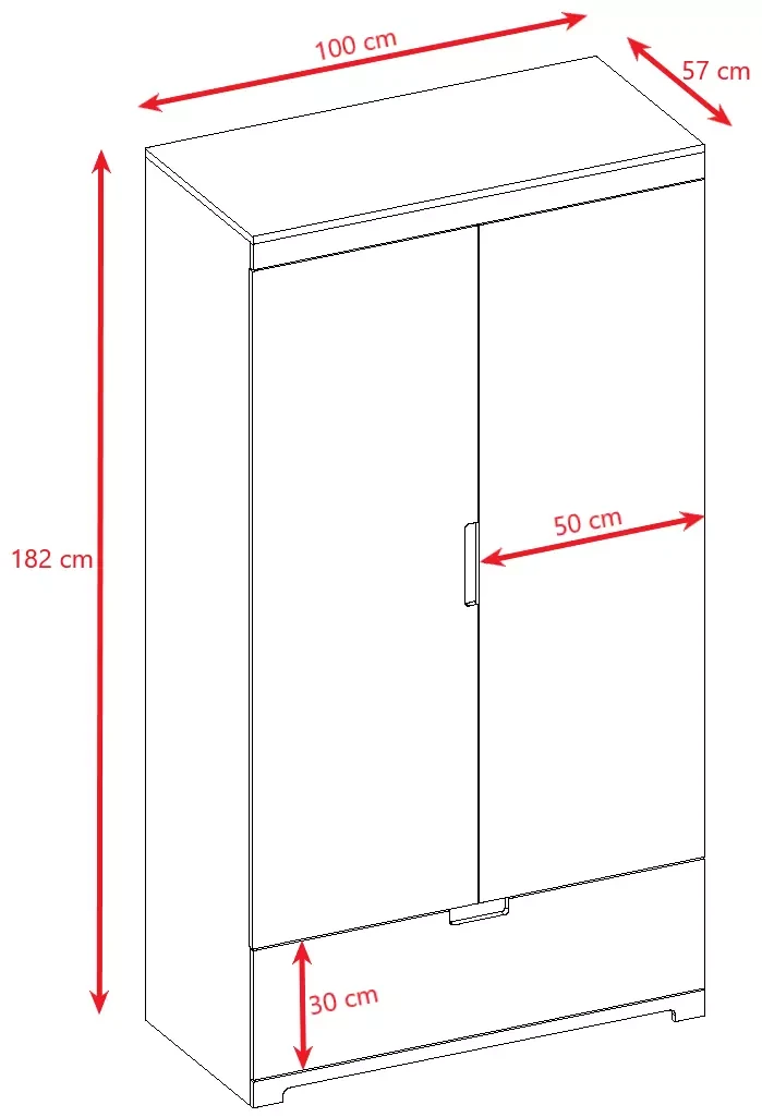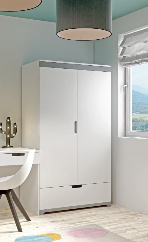 Szafa Tomi to klasyczna propozycja pojemnej oraz niezwykle przestronnej 2-drzwiowej szafy z serii mebli do pokoju dziecięcego TOMI. Korpus szafy wykonany został z wysokiej jakości płyty laminowanej w najgrubszym stosowanym rozmiarze czyli 18 mm. Solidna budowa gwarantuje trwałość i bezpieczeństwo użytkowania. Wykonane z płyty MDF fronty zostały 3-krotnie polakierowane atestowanymi farbami ekologicznymi. Szafa posiada pojemną szufladę osadzoną na prowadnicach kulkowych. Wewnątrz natomiast została ona podzielona na dwie części, z których jedna posiada drążek na wieszaki z odzieżą oraz górną półkę, a druga wyposażona jest w 4 półki. Cokół dolny i górny został 3-krotnie lakierowany farbą ekologiczną w kolorze szarości.