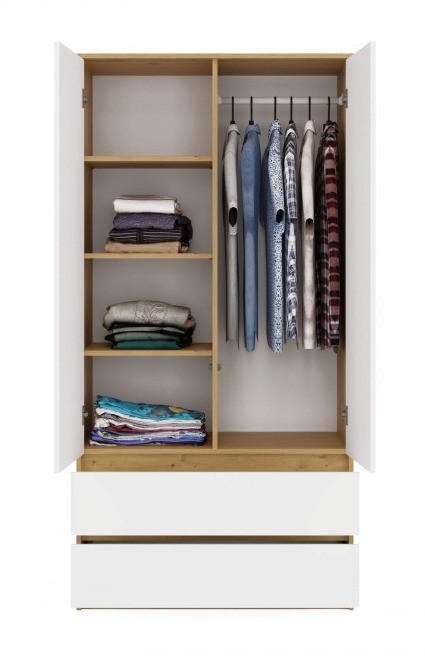 - Praktyczne wnętrze – cztery półki, dwie pojemne szuflady i przestrzeń na powieszenie ubrań pozwalają wygodnie zorganizować garderobę lub dokumenty.