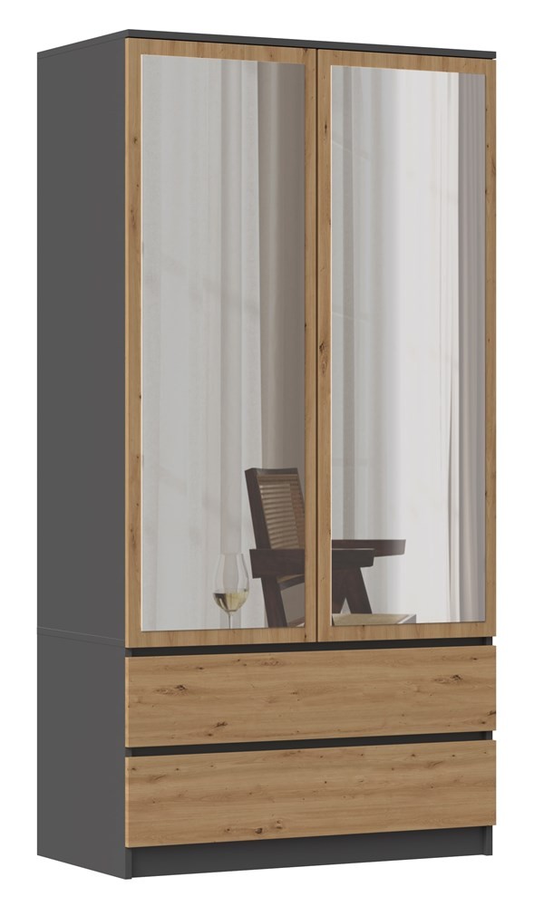 Szafa Malwa SS-90 z lustrami to elegancki i nowoczesny mebel, który doskonale łączy funkcjonalność z ponadczasowym stylem. Połączenie antracytowego korpusu z ciepłymi frontami w kolorze dąb artisan i dwoma dużymi lustrami optycznie powiększa przestrzeń i dodaje wnętrzu lekkości. Praktyczny układ wnętrza z półkami, drążkiem i szufladami pozwala uporządkować odzież i akcesoria w sposób wygodny i estetyczny.