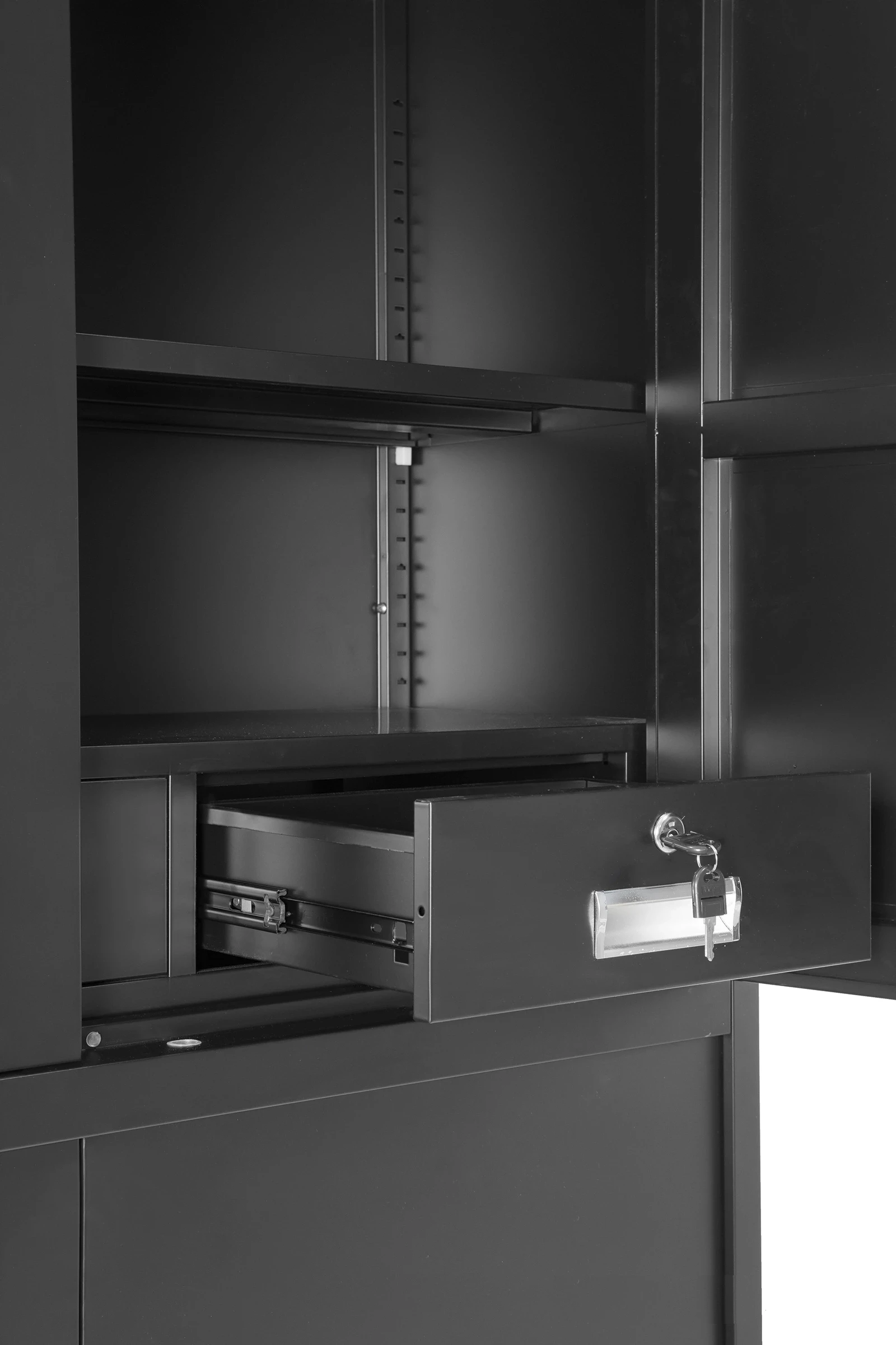 - Drzwi szafki wyposażone w 2 zamki elektroniczne, dodatkowo zamykane na klucz (w komplecie 2 klucze)