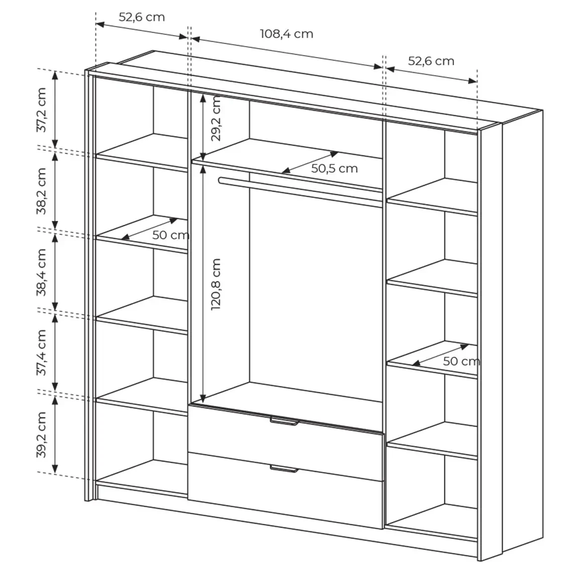 - Pojemność i funkcjonalność: Duża przestrzeń do przechowywania z półkami, szufladami i drążkiem na ubrania.