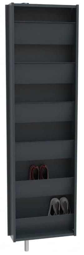 Home to praktyczna i trwała szafa do przechowywania obuwia, która pozwala pomieścić około 12 par butów. Prezentowany model szafy na buty został stworzony po to, żeby dzięki obrotowemu mechanizmowi zaoszczędzić miejsce w przedpokoju oraz pozwolić na funkcjonalne zagospodarowanie przestrzeni przeznaczonej na obuwie. Szafa wyposażona została w sześć skośnych półek mieszczących po 2 pary obuwia każda. Szafa została wykonana w całości z metalu i polakierowana na jeden z 3 dostępnych kolorów. Front szafki dodatkowo posiada powłokę imitującą strukturą naturalne drewno oraz funkcjonalne lustro, które optycznie powiększy pomieszczenie i przyda się, aby przejrzeć się przed wyjściem. Kolekcja Home zawiera lekkie i minimalistyczne bryły, które odnajdą się w każdym przedpokoju, są to szafka na buty, komoda, wieszak, lustro oraz szafa obrotowa.