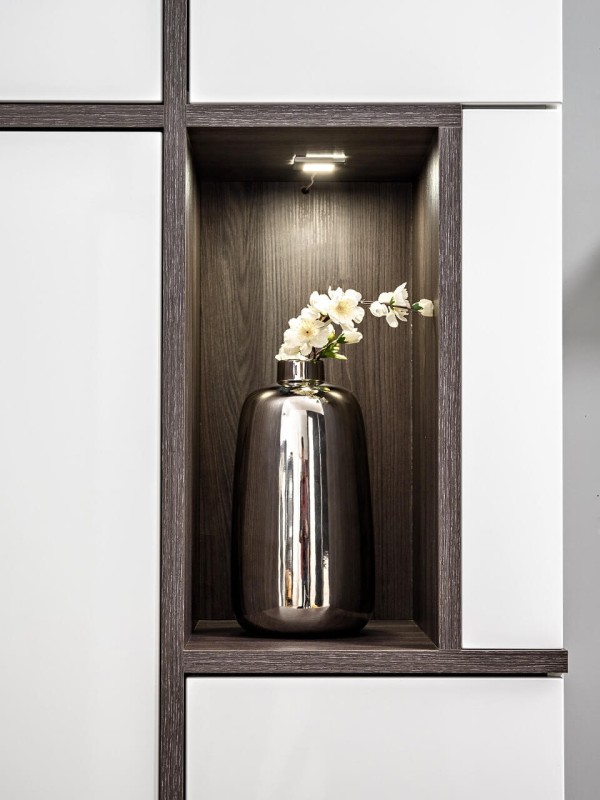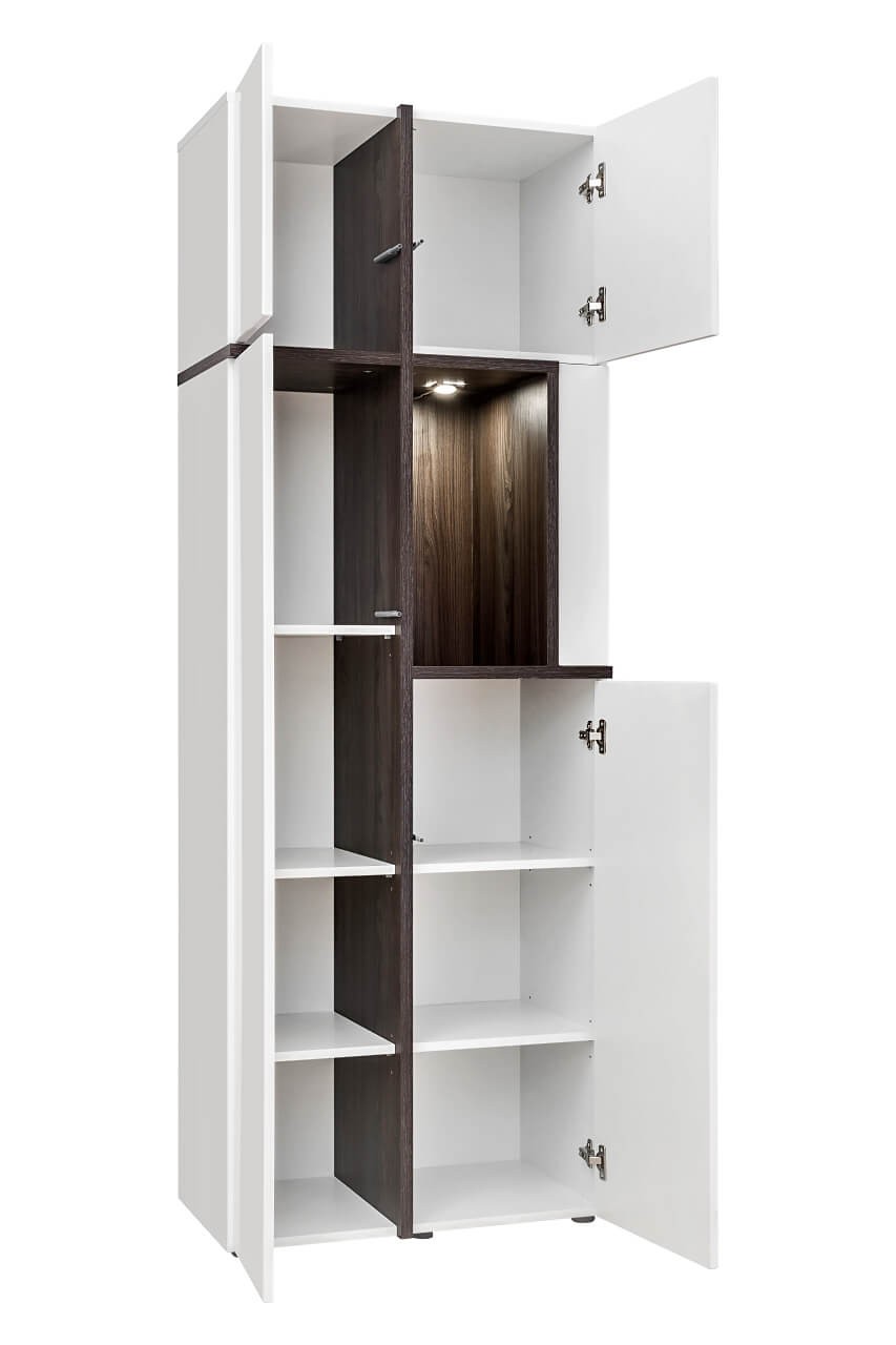 Wysoka szafa stojąca Cross łączy w sobie elegancję i nowoczesność, będąc doskonałym wyborem dla każdego, kto ceni sobie zarówno funkcjonalność, jak i wyjątkowy design. Wykonana w kolorze białym, szafa ta jest ozdobiona aplikacjami w odcieniu perła ELM, co dodaje jej wyrafinowanego charakteru i subtelnie kontrastuje z głównym kolorem. W centralnej części znajduje się otwarta komora, którą dodatkowo podkreśla białe oświetlenie Quad LED, tworząc idealne miejsce do eksponowania ulubionych przedmiotów czy książek, jednocześnie wprowadzając przytulną atmosferę do pomieszczenia.