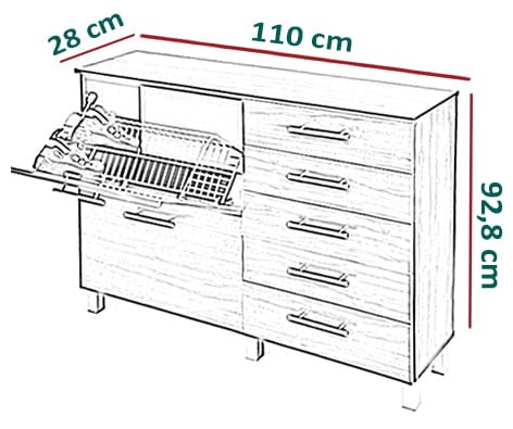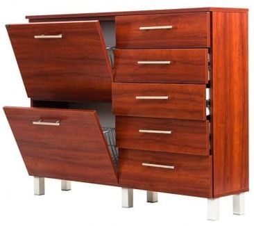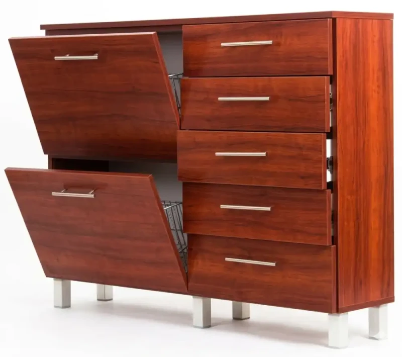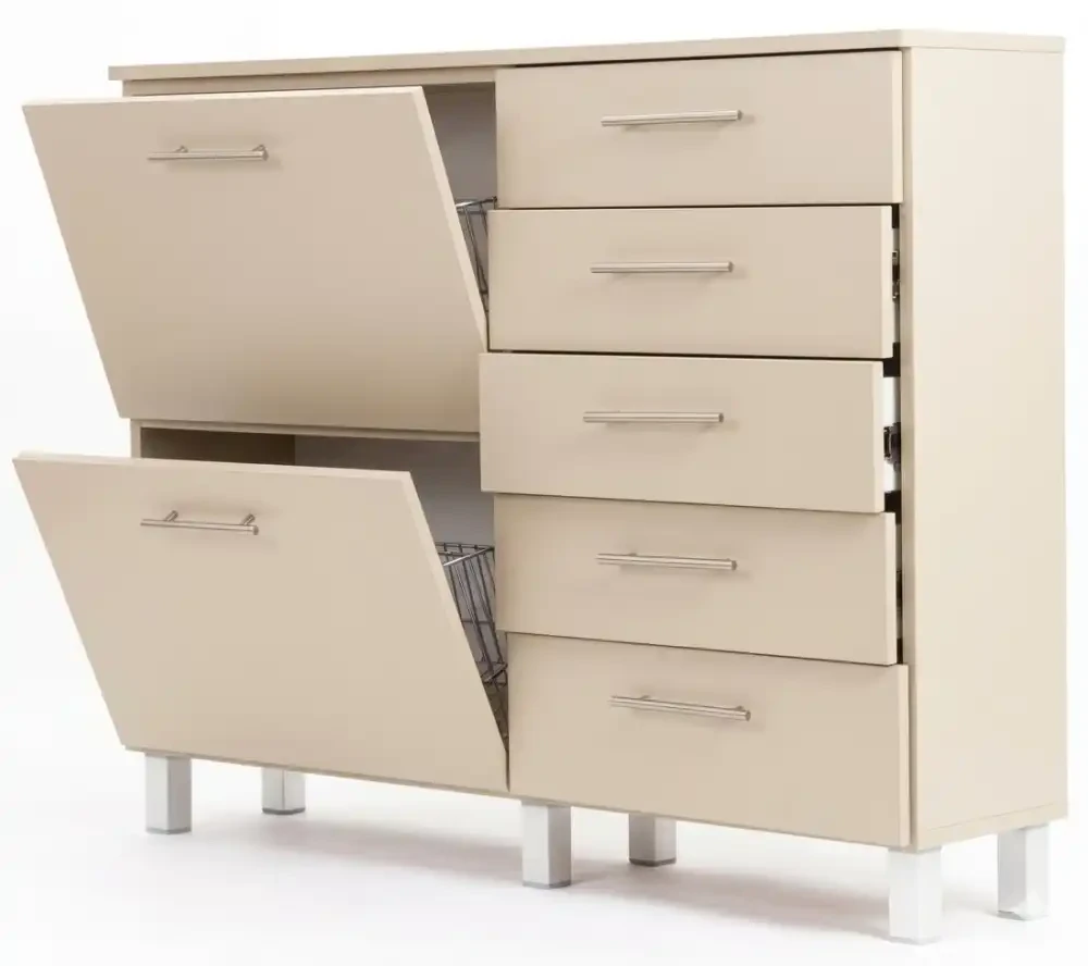 - funkcjonalna i pojemna szafka do przedpokoju - dwa dwurzędowe kosze na obuwie (mogące pomieścić łącznie do 12 par obuwia) oraz 5 szuflad na pełen wysuw stanowią doskonałe miejsce do przechowywania nie tylko butów, ale też innych podręcznych rzeczy, takich jak środki do czyszczenia obuwia, klucze, czapki czy szaliki