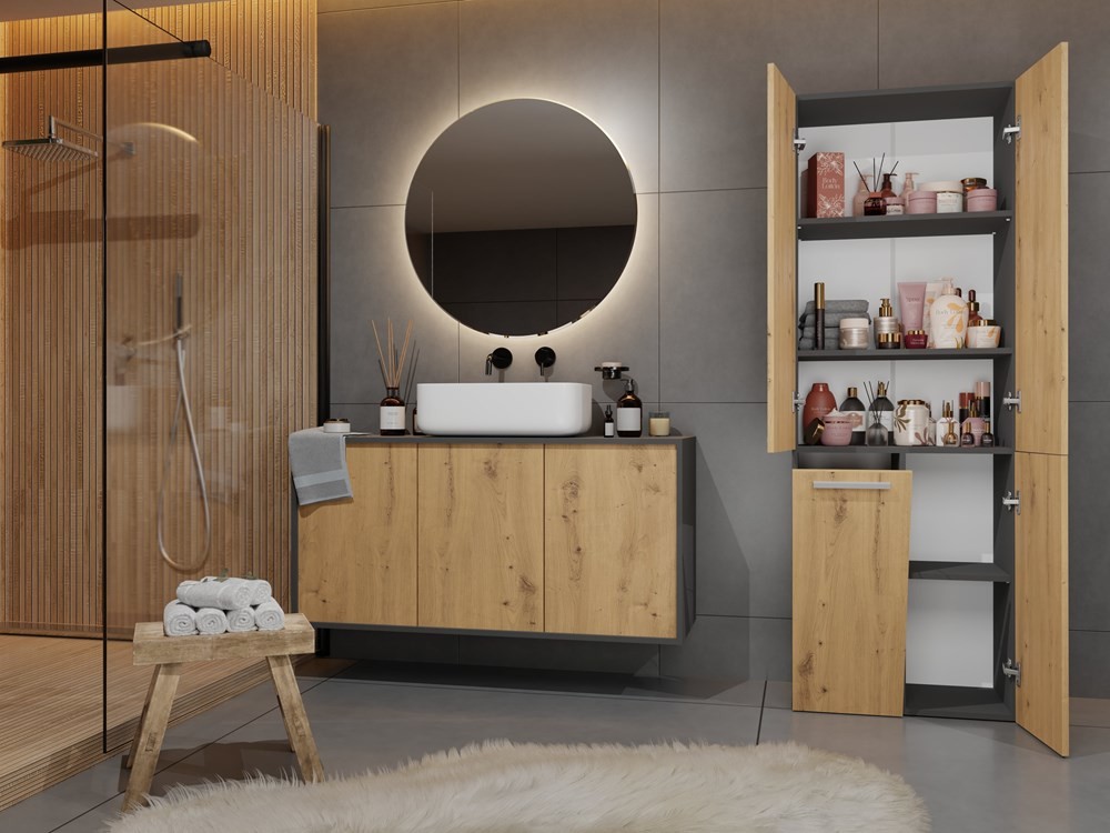 - Ponadczasowa kolorystyka - modne zestawienie antracytu z dębem artisan wprowadza do wnętrza elegancję i ciepło, komponując się z wieloma stylami łazienek.