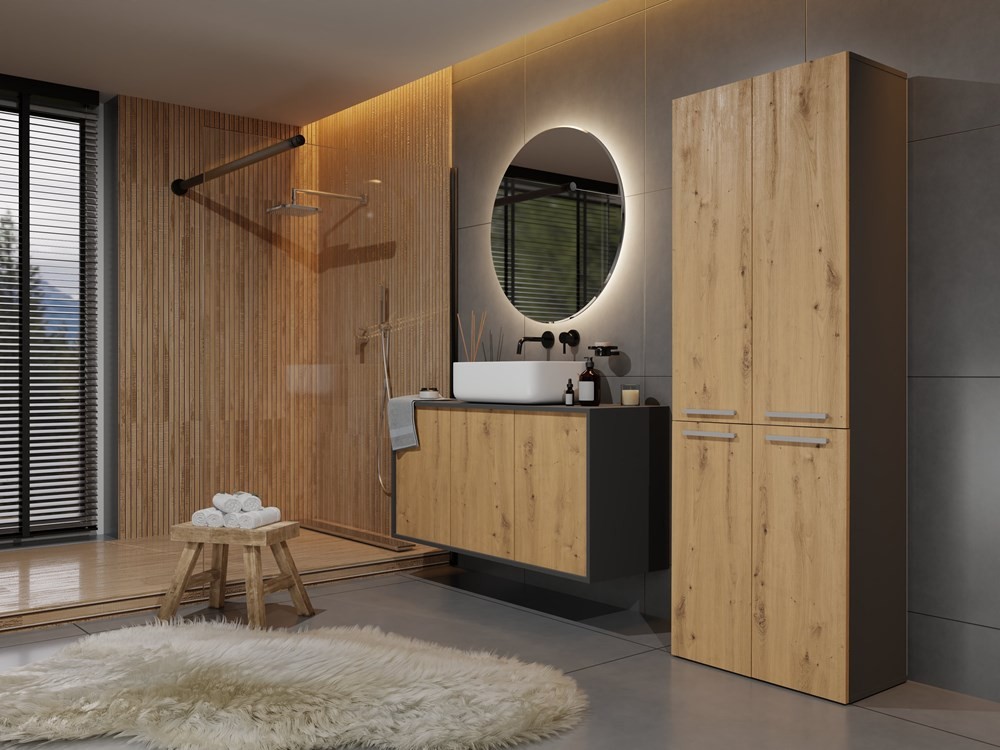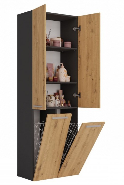 Szafka łazienkowa NEL DD-2K to elegancki i funkcjonalny mebel, który doskonale sprawdzi się w każdej łazience, pomagając utrzymać porządek i wykorzystać przestrzeń w praktyczny sposób. Modne połączenie antracytu z ciepłym dekorem dąb artisan nadaje meblowi nowoczesnego charakteru, a jednocześnie wprowadza do wnętrza przytulność. Dzięki dwóm koszom i pojemnym półkom szafka oferuje jeszcze więcej możliwości przechowywania.