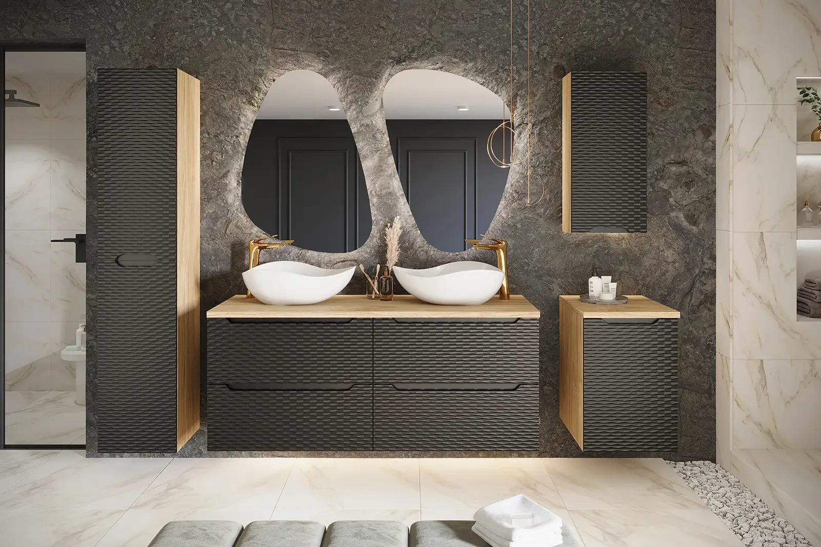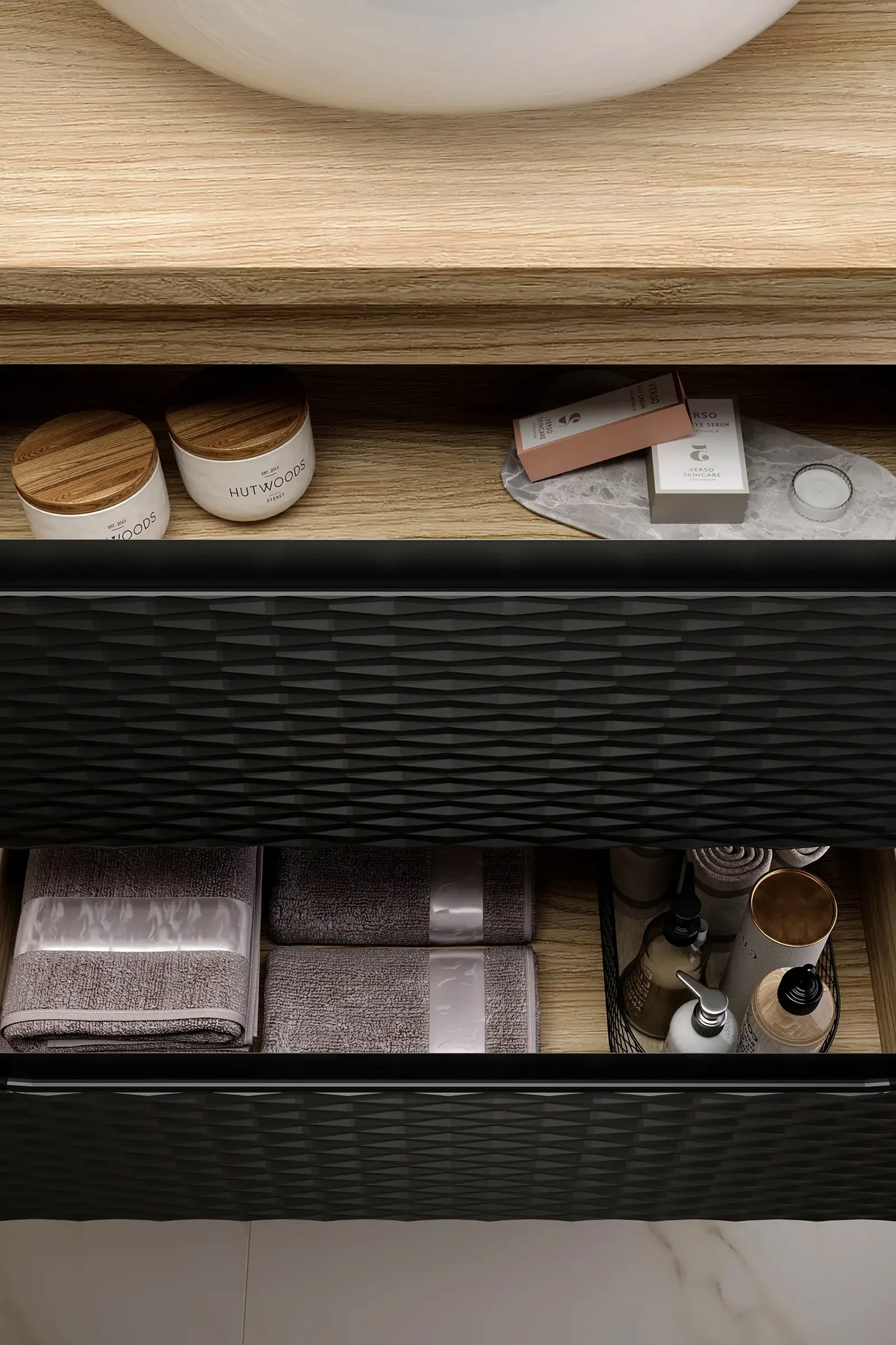 Szafka pod umywalkę z serii OCEAN BLACK jest doskonałym przykładem, jak nowoczesny design może harmonijnie współgrać z naturą, czerpiąc inspiracje z majestatycznego oceanu. Seria ta jest wynikiem fascynacji twórców oceanem, a każdy element kolekcji odzwierciedla jego dynamikę i nieprzewidywalność. Charakterystyczne dla mebli OCEAN fronty zdobią poziome fale, które przyciągają wzrok i są wyjątkowym elementem dekoracyjnym. Korpus szafki wykonany został z laminowanej płyty o barwie Dębu Olejowanego, co dodaje naturalnego wyglądu i trwałości. Front w kolorze czarnym, wykonany z płyty MDF, ma frezowany wzór fal, co nadaje trójwymiarowość. Ta kombinacja kolorystyczna pozwala na łatwe wprowadzenie szafki do różnych aranżacji wnętrz, zachowując jednocześnie spójność i elegancję. Szafka jest wyposażona w dwie szuflady z mechanizmem cichego domyku, co podnosi komfort użytkowania. Posiada również zintegrowane uchwyty, co jest nietypowym rozwiązaniem, zwiększającym estetykę i jednolitość designu. Wnętrze szafki oferuje praktyczną i obszerną przestrzeń do przechowywania. Kolekcja OCEAN, z jej unikalnym połączeniem funkcjonalności, estetyki i inspiracji naturą, stanowi idealny wybór dla osób poszukujących spokoju i harmonii we własnym domu, przypominając o bezgranicznych głębiach oceanu.