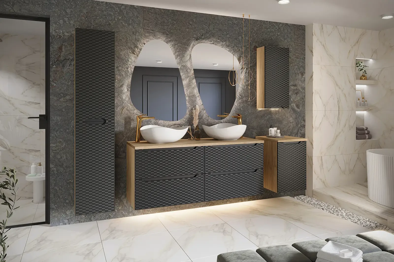 - trójwymiarowe fronty z falami – charakterystyczne, poziome fale na frontach mebli, które nadają głębi i dynamiki
