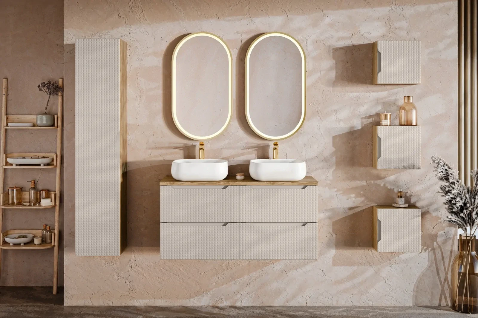 Szafka pod umywalkę LUXOR BEIGE to kwintesencja prostoty i wyrafinowania, gdzie każdy detal zdaje się być niepowtarzalnym dziełem sztuki. Charakterystycznym elementem mebla są trójwymiarowe kwadratowe piramidki na frontach, które tworzą hipnotyzujący wzór. Ta unikalna cecha nadaje głębi i charakteru, sprawiając, że szafka jest nie tylko funkcjonalna, ale i niezwykle stylowa. Mebel wykonany jest z najwyższej jakości płyty laminowanej i MDF, co zapewnia ich trwałość i solidność. Bezowy kolor frontu podkreśla minimalistyczny charakter kolekcji, co czyni te meble wyrafinowaną ozdobą każdego wnętrza. Dodatkowym atutem są zintegrowane uchwyty, które podkreślają nowoczesny charakter szafki, oraz zawiasy z cichym domykiem, co zapewnia komfort użytkowania. Szafka wyposażona została w pojemne szuflady, które umożliwiają efektywne przechowywanie różnorodnych akcesoriów łazienkowych. Kolekcja LUXOR sprawdzi się zarówno w małych, jak i dużych przestrzeniach, dostarczając estetycznego uzupełnienia wnętrza oraz niezawodnej funkcjonalności na lata użytkowania.